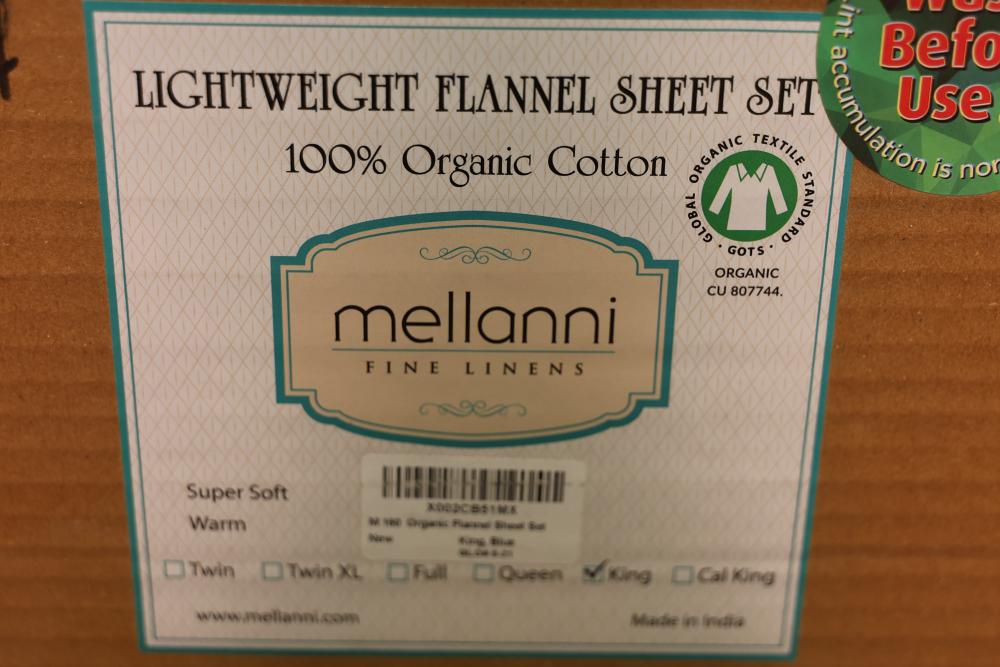 Mellani Organic Lightweight Flannel Sheet Set in Gray, King Size. Made of 100 percent organic cotton, featuring a super soft and warm texture. The set comes sealed in its original packaging, ensuring quality and cleanliness. Ideal for king-size beds. Pickup only.