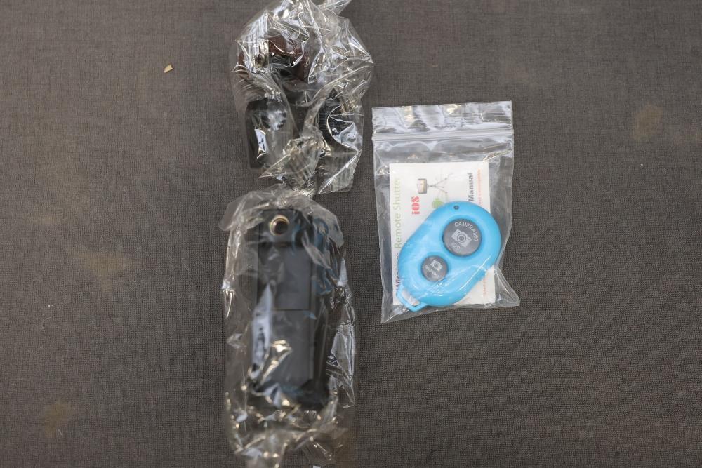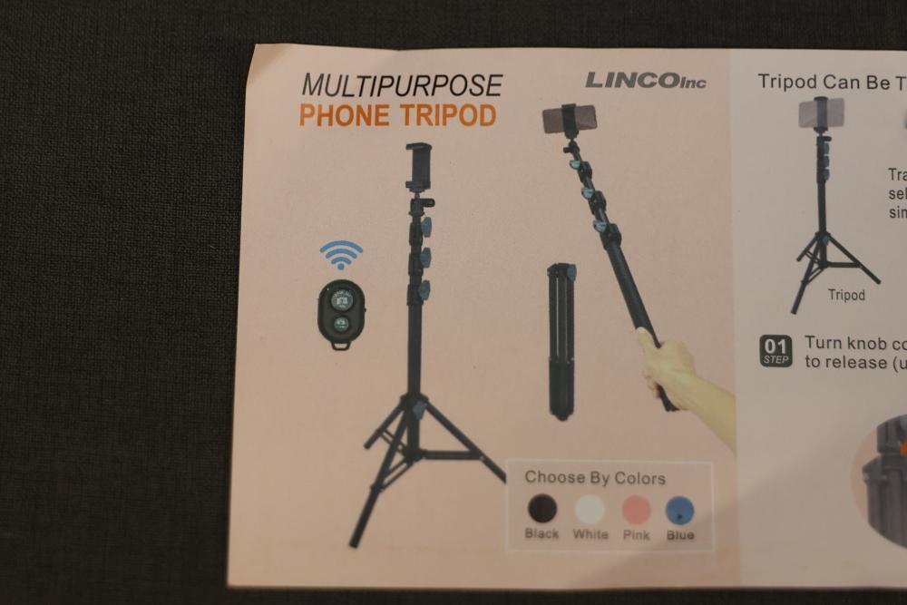 Linco Multipurpose Phone Tripod featuring a versatile tripod that can be converted into a selfie stick. Includes remote shutter for Android and iOS devices, assembly instructions, and other accessories. Compact and easily transportable. Pickup only.