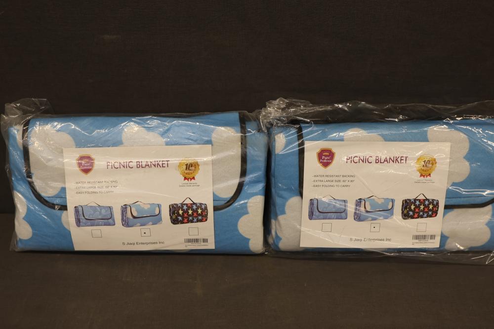 Pure Protector Water Resistant Picnic Blanket, Set of 2. Includes two extra-large blankets measuring 59 by 80 inches. Features water-resistant backing and folds easily for portability. Blue cloud design with a carrying handle for convenience. Pickup only.