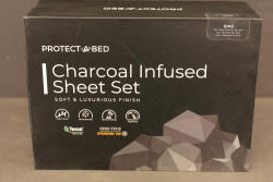 Protect-A-Bed King Size Charcoal Infused Sheet Set. Includes 1 fitted sheet (76 x 80 x 22 in), 1 flat sheet (118 x 110 in), and 2 pillowcases (21 x 37 in). Features soft-touch fabric, charcoal infusion for odor control, temperature regulation, and is OEKO-TEX Standard 100 certified. Water-resistant and machine washable. Pickup only.