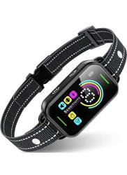 Dinjoo Smart Dog Bark Training Collar with adjustable black strap and digital display. Features include color screen design, smart barking recognition system, motion detection, 8 sensitivity levels, warning tone mode, vibration mode, electric shock mode, IP67 waterproof rating, and rechargeable battery. Comes with a user guide for operation. Pickup only.