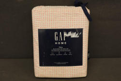Gap Home Full Size Sheet Set in Block Print Dot Pattern. Includes one full flat sheet (82 in x 96 in), one full fitted sheet (54 in x 75 in x 15 in mattress), and two standard pillowcases (20 in x 30 in). Made from a blend of 60 percent organic cotton and 40 percent recycled polyester. Features sustainable material and easy care design. Pickup only.