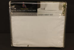 Isabella Cromwell Luxe Ultra Soft Collection Queen Size Sheet Set in White. Includes one queen flat sheet measuring 90 in x 102 in, one queen fitted sheet measuring 60 in x 80 in and accommodating mattresses up to 17 in deep, and two standard pillowcases measuring 20 in x 30 in. Made of 100 percent cotton percale for a soft and durable finish. Machine washable. Pickup only.