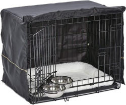 MidWest Homes For Pets iCrate Pet Crate Petite Size, Model 1524DD. Includes a petite-sized folding metal crate, removable pan, two stainless steel bowls with brackets, a fleece pet bed, and a crate cover. Designed for convenience and comfort with double doors for accessibility. Pickup only.