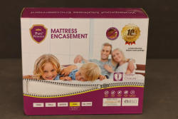 Pure Protector Waterproof Mattress Encasement King Size in White. Designed to fit mattresses sized 78 inches x 80 inches with a depth of up to 14 inches. Features a zipper closure for a secure fit. Provides protection against water, dust mites, pollen, and bed bugs. Made from a blend of 100 percent polyester knit fabric laminated with polyurethane for durability and effective moisture resistance. Pickup only.