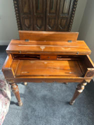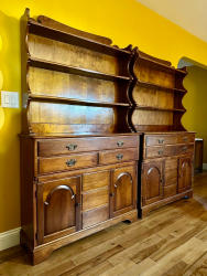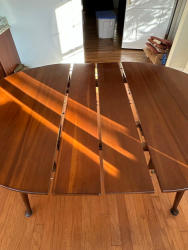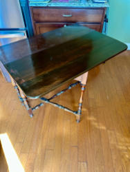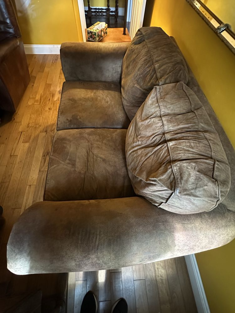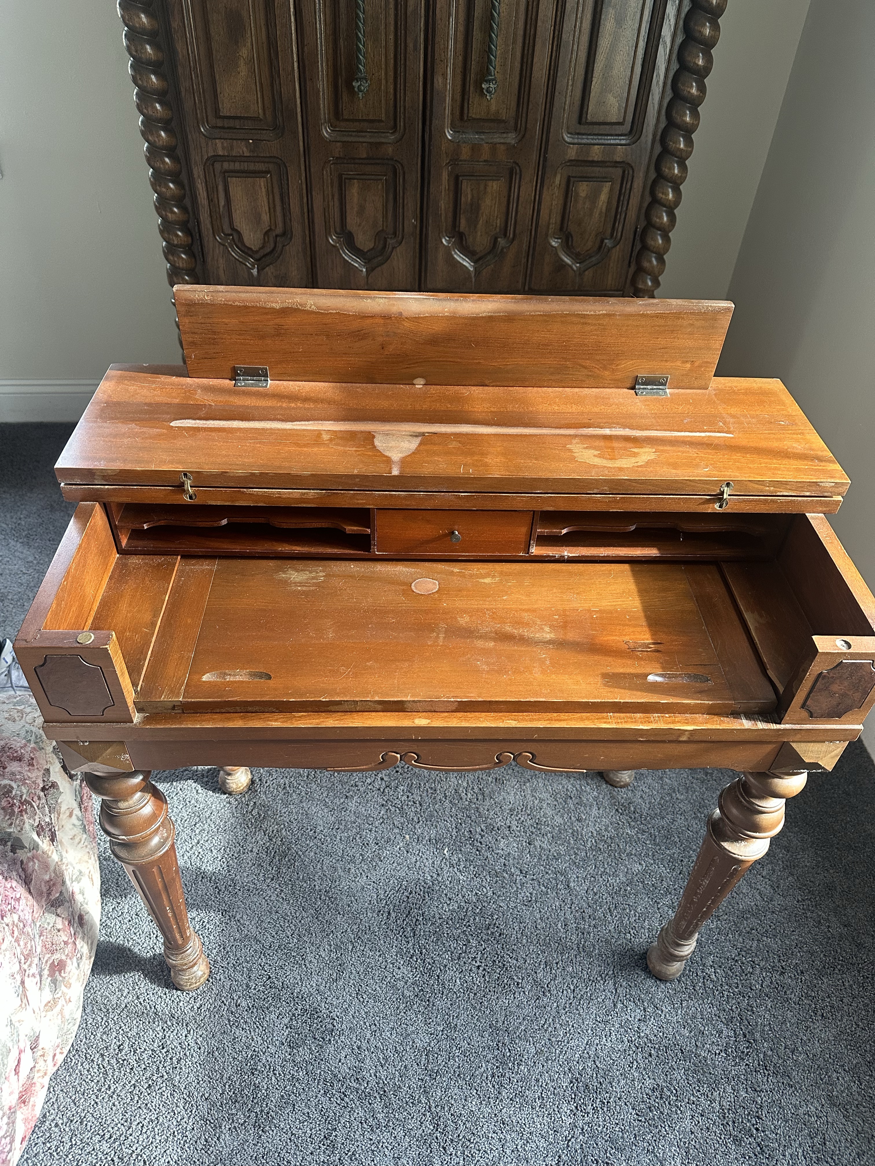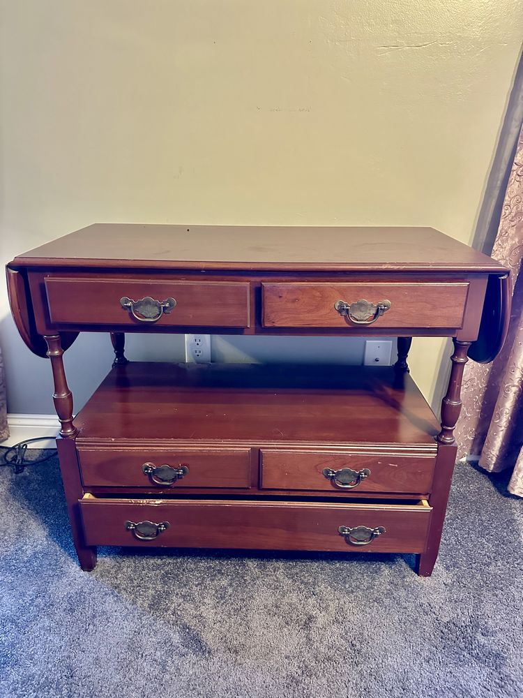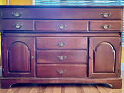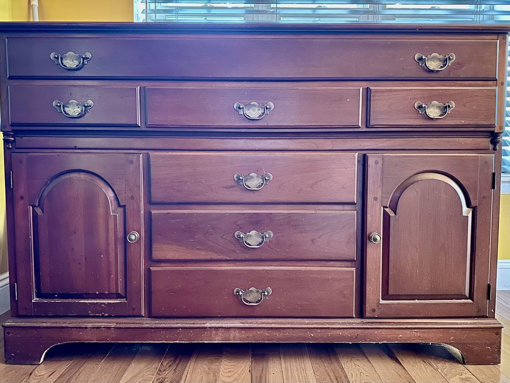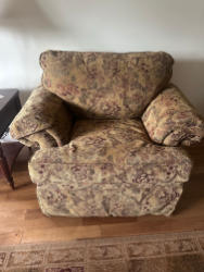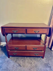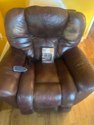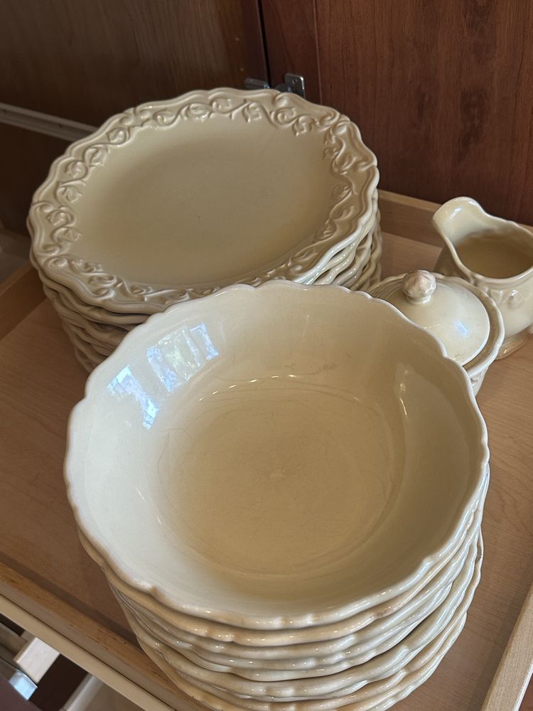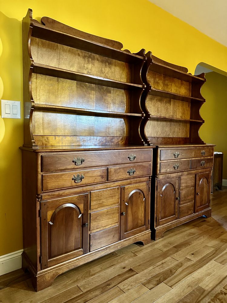 Items include LA-Z Boy remote control electric leather recliner; Chris Madden for JCPenney 10 place settings stoneware; Early American style matching pair of solid cherry wood hutch; American Colonial-Revival style drop-leaf server/console; vintage cherry drop-leaf dining table w/leaves, Queen Anne feet; tapestry sofa bed & love seat; four-piece Mediterranean bedroom set; Broyhill suede-like overstuffed love seat; metal lamp; vintage wall mirror & more. Items are located in Highland, NY.