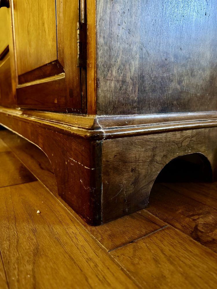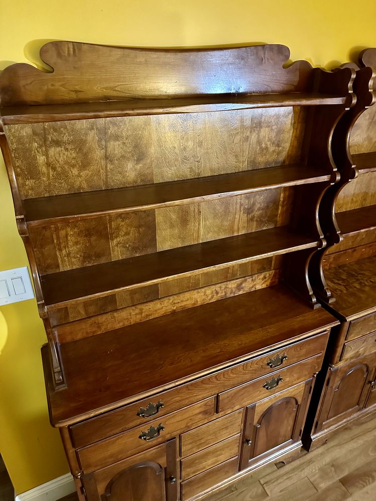 Early American style matching pair of solid cherry wood hutches. Detachable upper 3-shelf unit over 3 drawers and 2 enclosed storage shelves. Pegged joinery. Believed to be craftsman-made special order many years ago. These are solid, weighty pieces of furniture. Bring help to move. (L 42.5 x W 13.5 x H 70.5 each.)