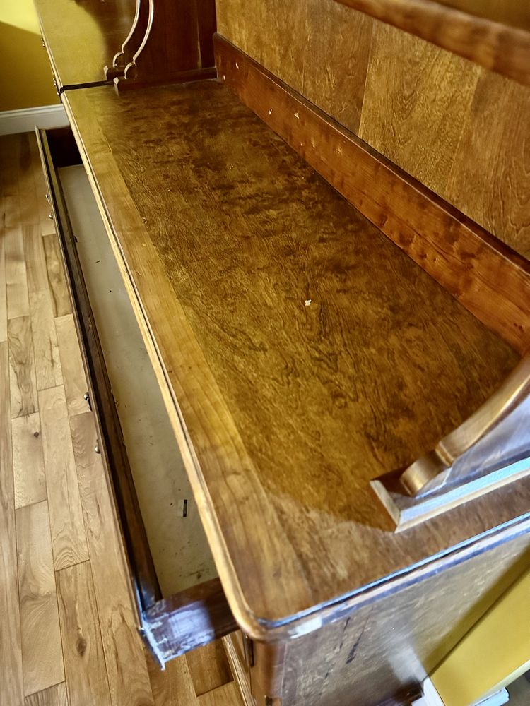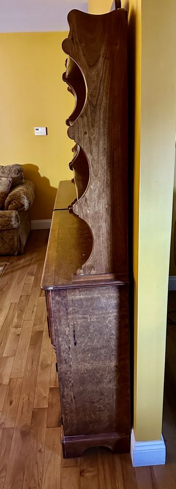 Items include LA-Z Boy remote control electric leather recliner; Chris Madden for JCPenney 10 place settings stoneware; Early American style matching pair of solid cherry wood hutch; American Colonial-Revival style drop-leaf server/console; vintage cherry drop-leaf dining table w/leaves, Queen Anne feet; tapestry sofa bed & love seat; four-piece Mediterranean bedroom set; Broyhill suede-like overstuffed love seat; metal lamp; vintage wall mirror & more. Items are located in Highland, NY.