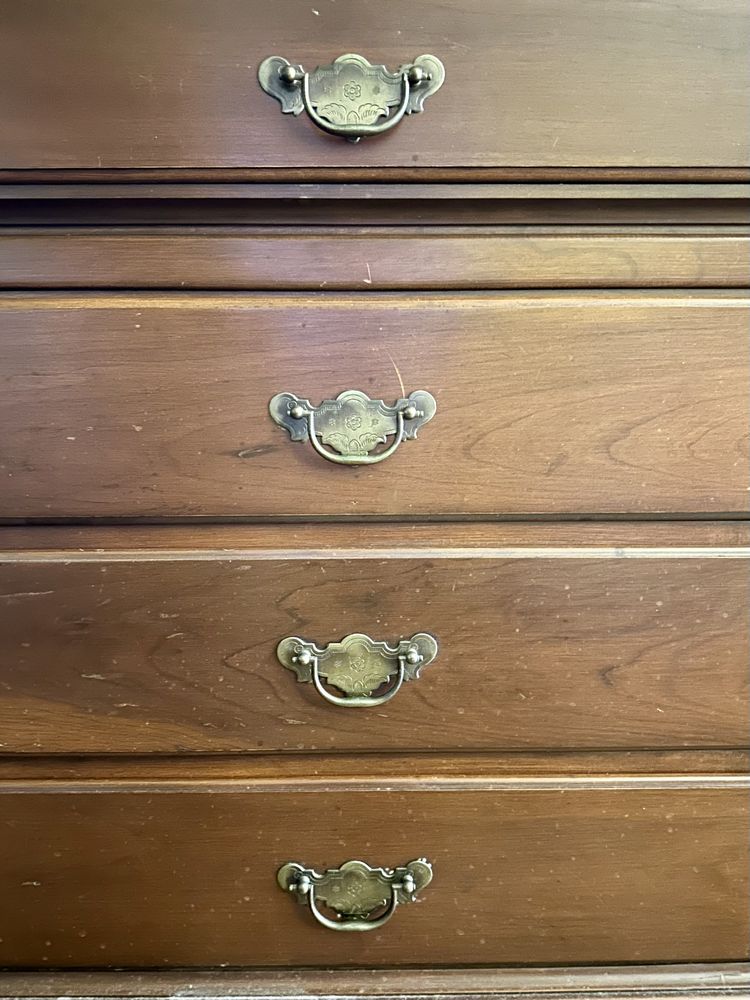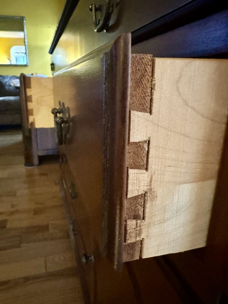 Early American style sideboard / buffet solid cherry wood with 7 drawers and 2 storage shelves. Incl. built-in silverware drawer. Dovetail joinery. This is a weighty piece of furniture that will give your home many years of useful service. (L 53.5 x W 20 x H 36)