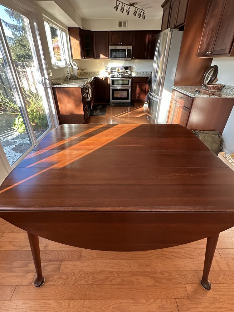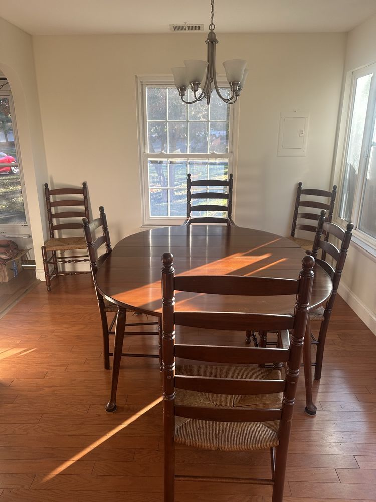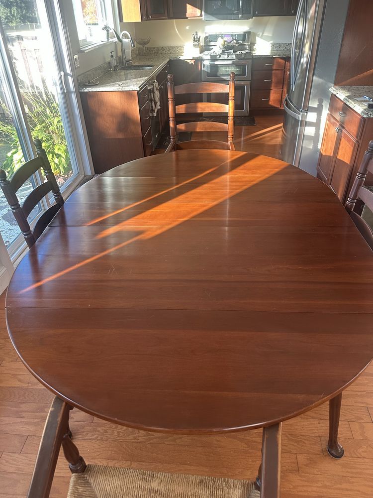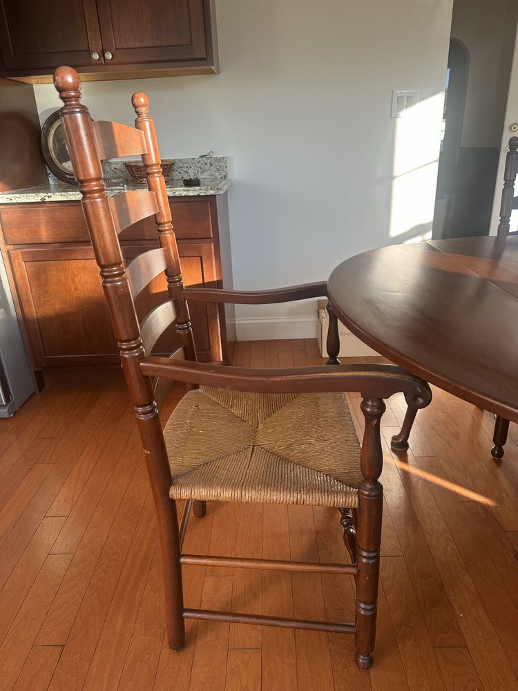 Vintage cherry drop-leaf dining table w/leaves, Queen Anne feet. 2 captain/4 side rush-seat chairs L 6’1” x W 54 1/4”