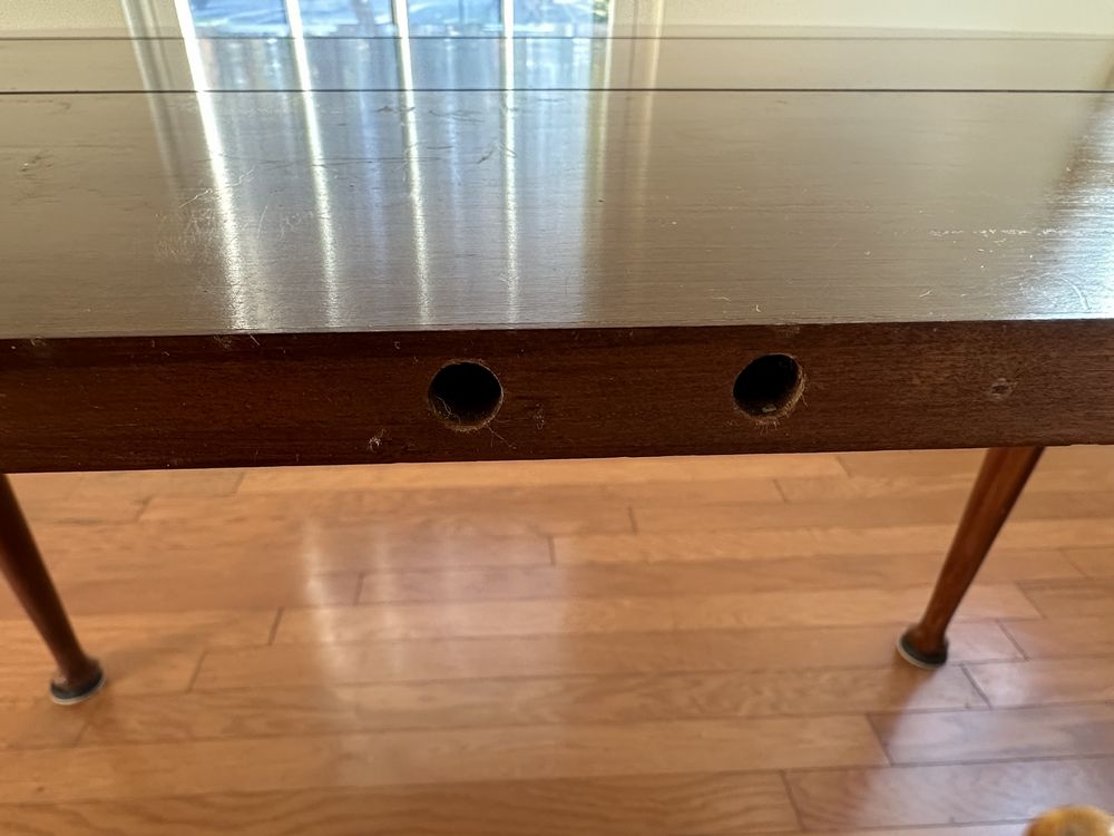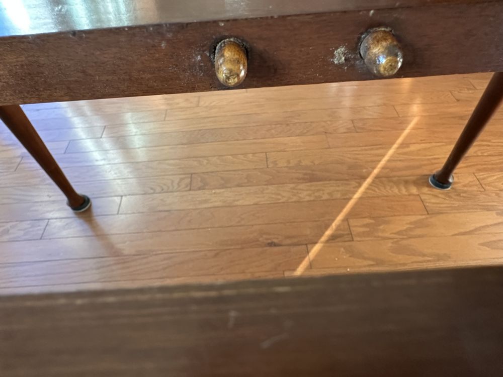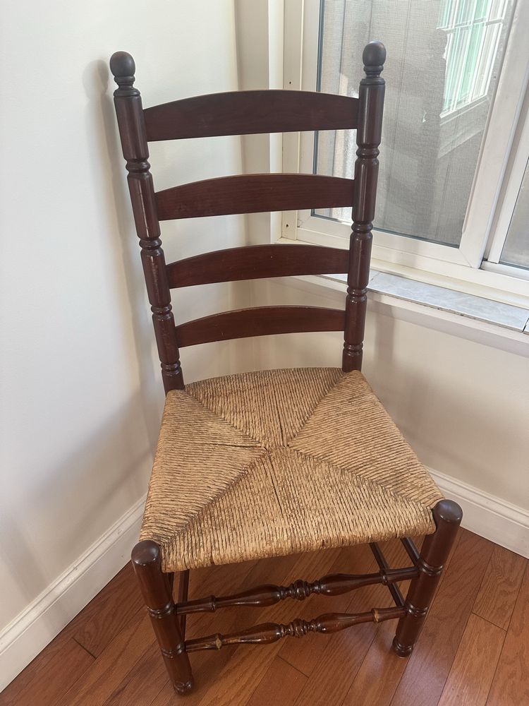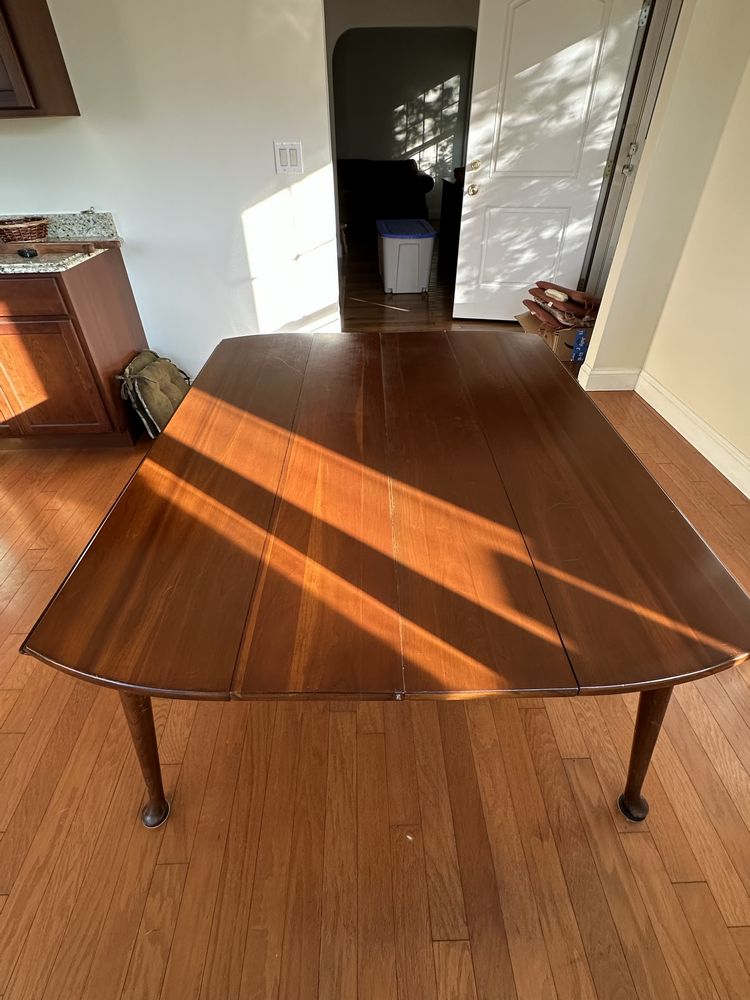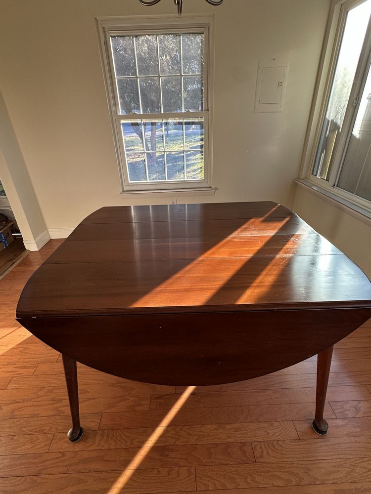 Vintage cherry drop-leaf dining table w/leaves, Queen Anne feet. 2 captain/4 side rush-seat chairs L 6’1” x W 54 1/4”