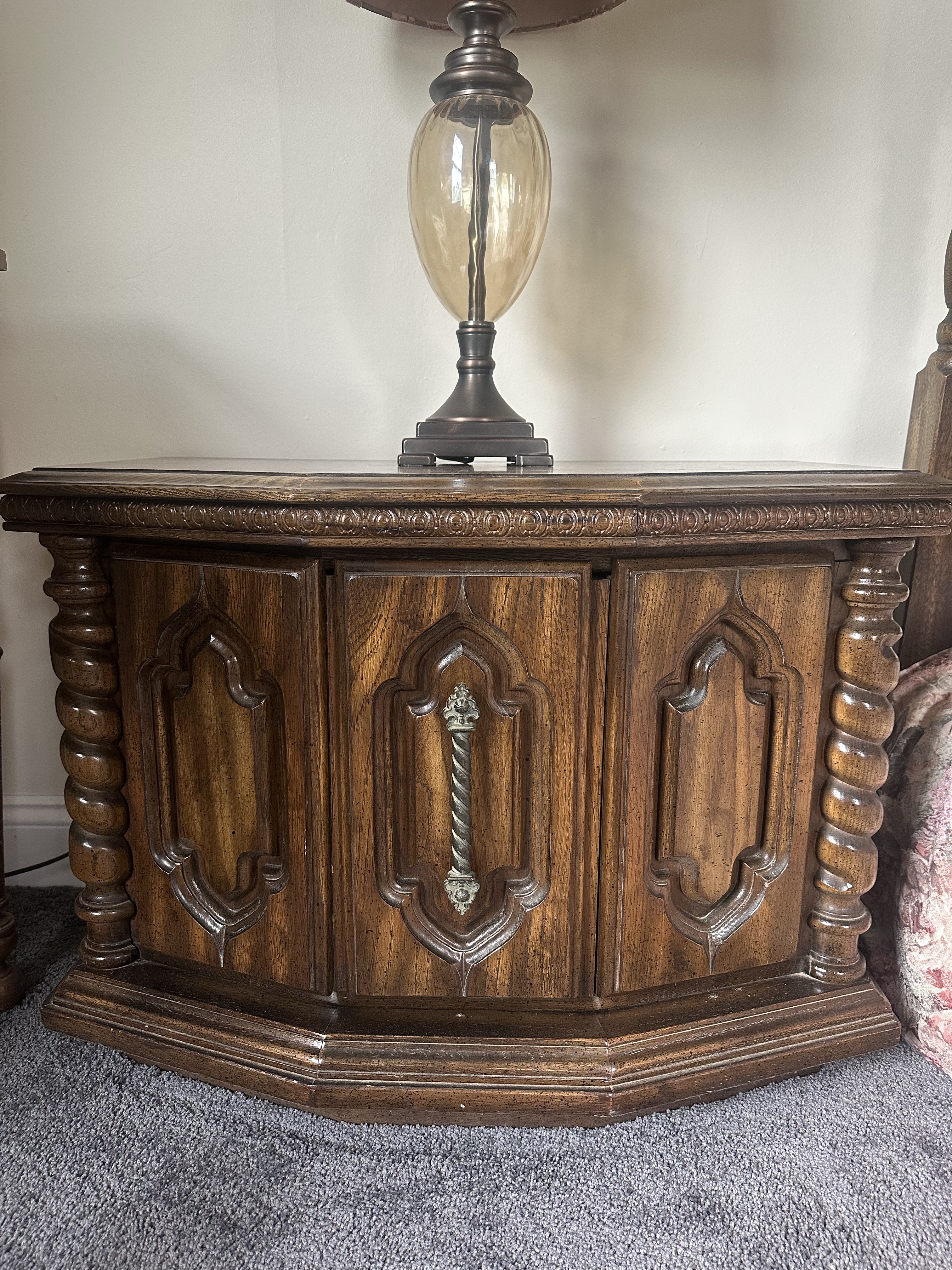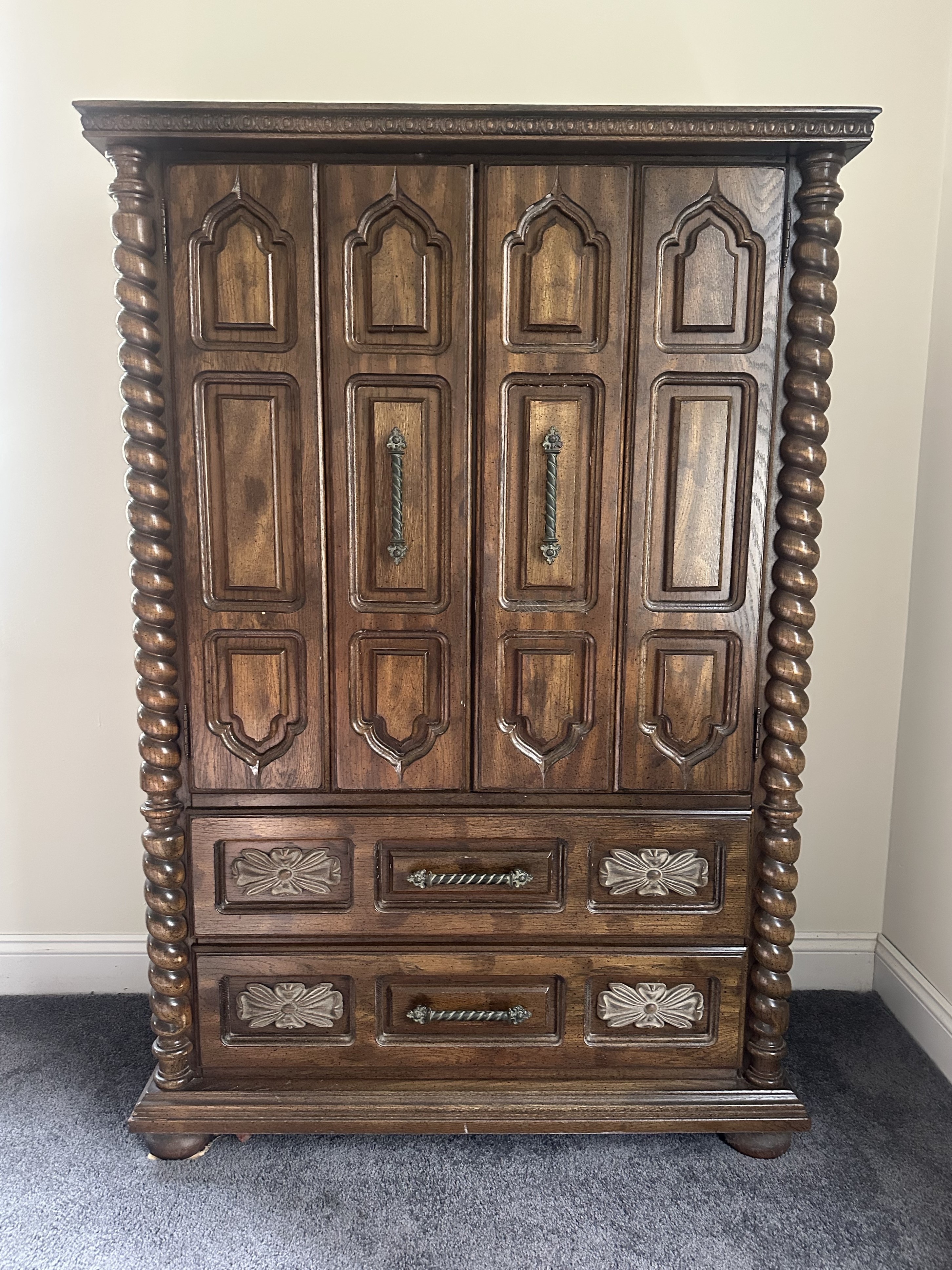 4-piece Mediterranean Bedroom set includes an armoire, two nightstands, and a headboard. Box spring and bed frame included (no mattress) Armoire measurements are H 61 x W 40 x D 18. Nightstands measure H 29 x W 32.5 x D 17.5