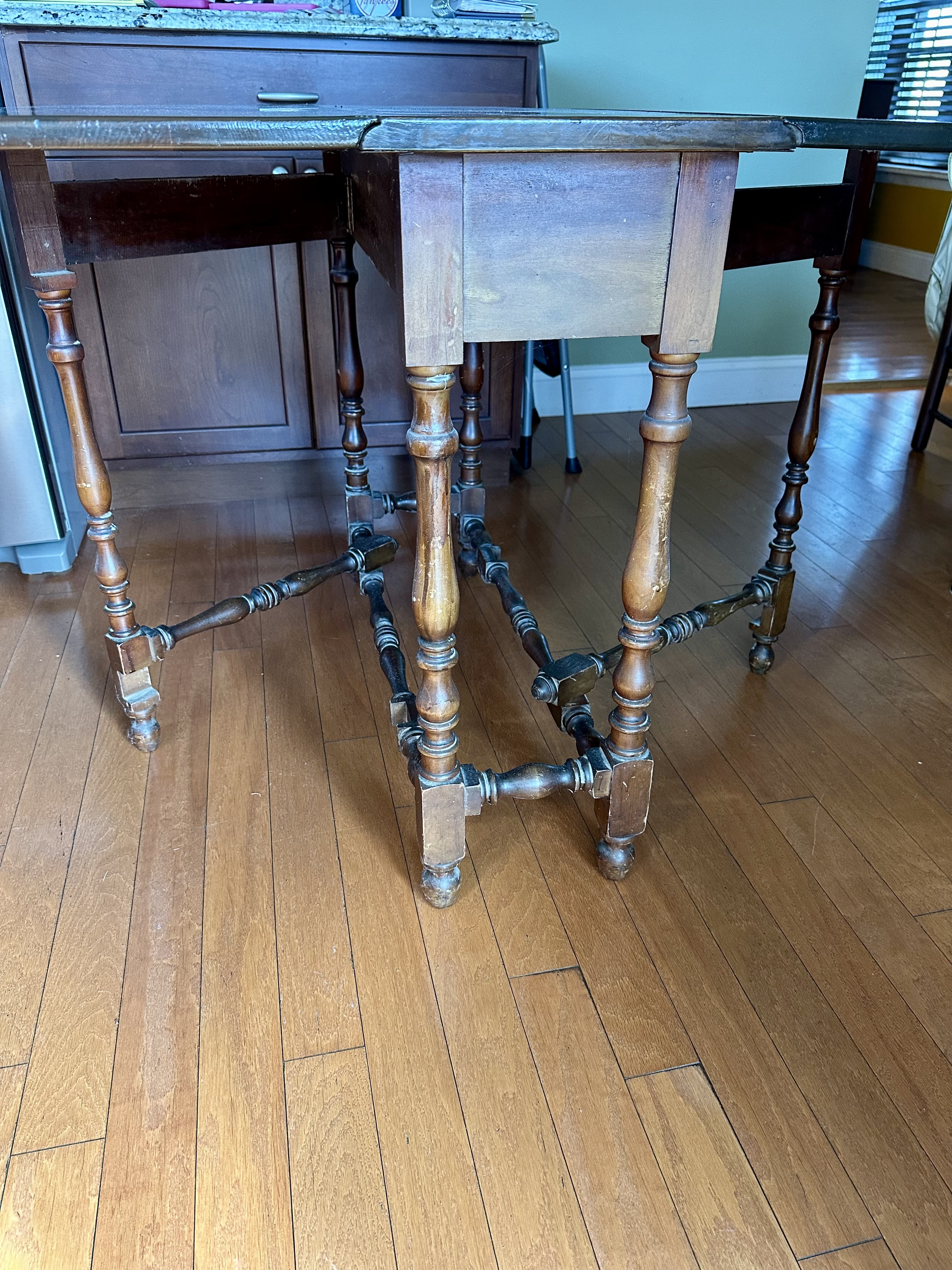 Early Revival / Queen Ann style Gate Leg Drop Leaf Table. Mahogany or mahogany finish. Turned legs and older vintage hardware. L 40.5 x H 30 x W 36