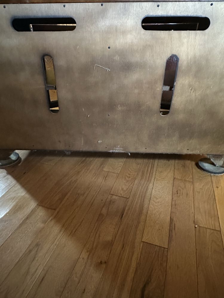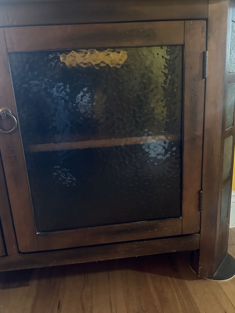 Wooden Television Cabinet.2 doors, 4 shelves. W 45 1/4 x D 18 x H 27 1/4. Angled sides with faux stone accents. Doors have quality frosted see through panels. Beautiful and functional piece of furniture.