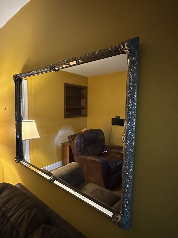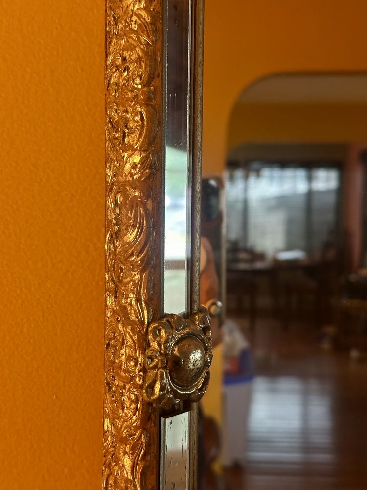 Vintage wall mirror with wood overlay. Beveled mirror sides. Some wood overlays are missing. Approximate H 33 x W 44. Plus modern decorative round metal mirror with enamel accents. W 20 x H 22.5