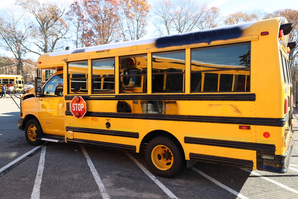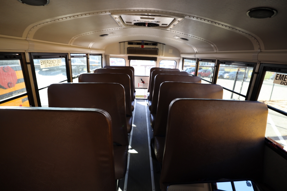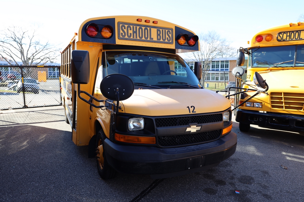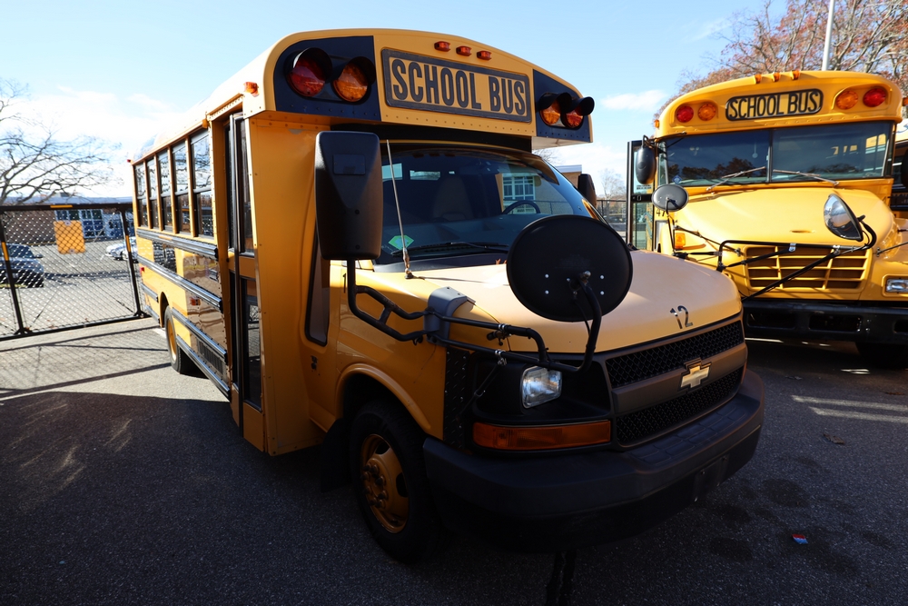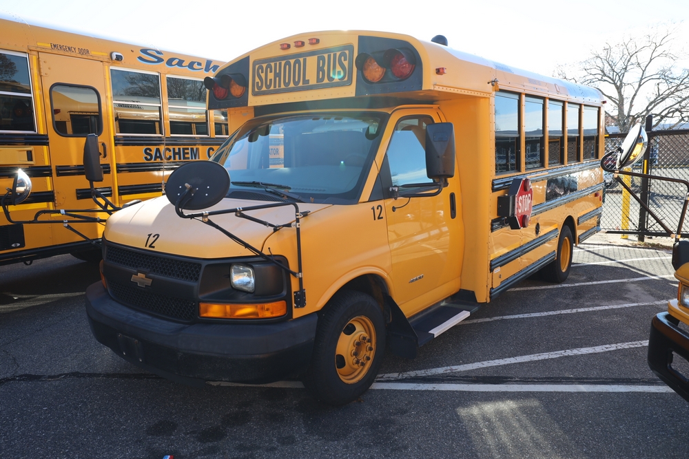 Items include 2007 Blue Bird Vision school bus; Troy-Bilt snow blower; 2011 Chevrolet Express 4500 school bus; Craftsman, Cub Cadet & Toro riding mowers; Traulsen two-door freezer & Motion Fitness/Positive Gaming student dance system dance game boards. Items are located in Ronkonkoma, NY.