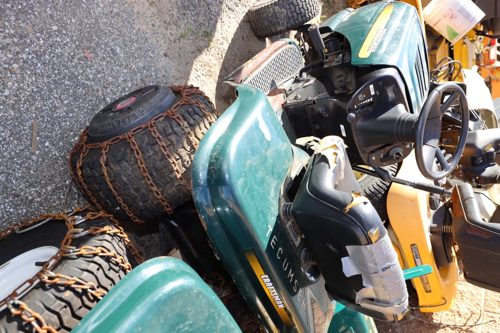 Items include 2007 Blue Bird Vision school bus; Troy-Bilt snow blower; 2011 Chevrolet Express 4500 school bus; Craftsman, Cub Cadet & Toro riding mowers; Traulsen two-door freezer & Motion Fitness/Positive Gaming student dance system dance game boards. Items are located in Ronkonkoma, NY.
