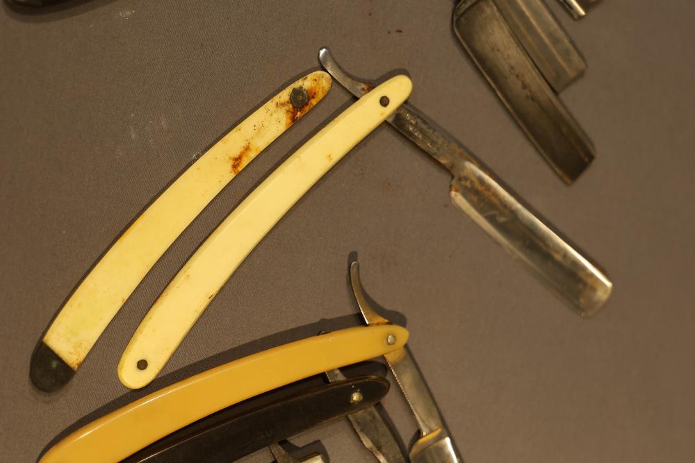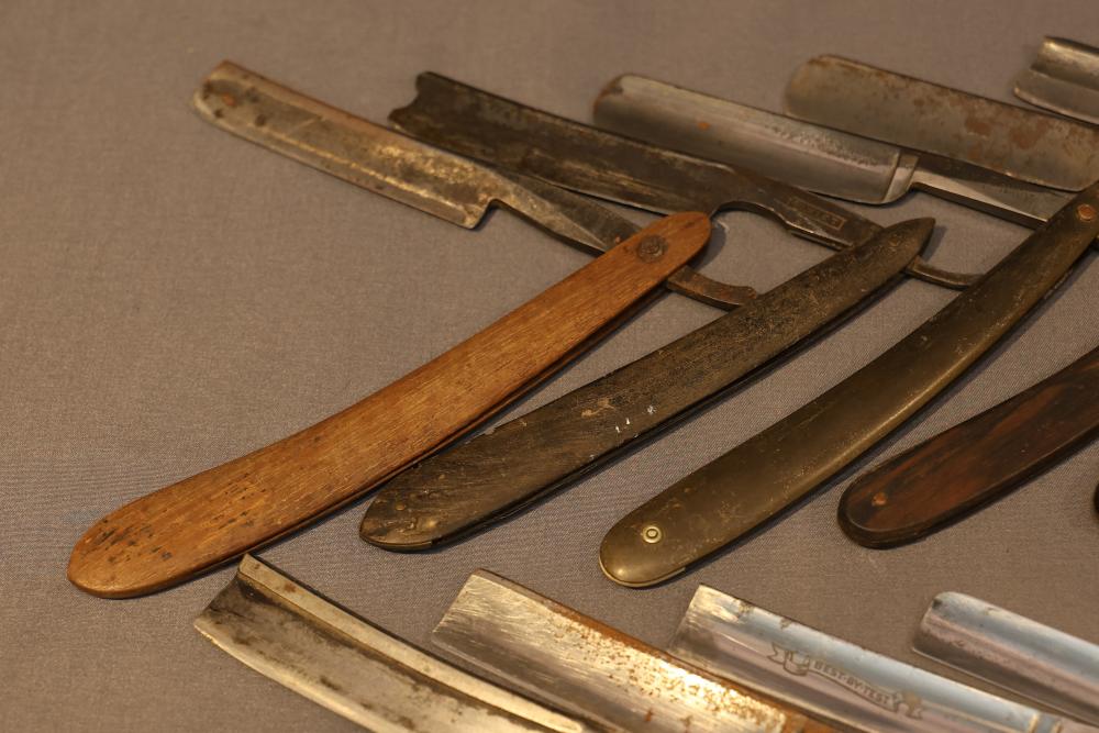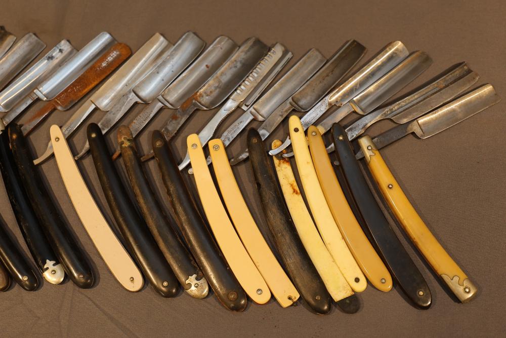 20 Straight Razors with makers marks such as Ontario Cutlery, Amendola Special, and Frederick Reynolds, featuring wood, horn, and celluloid scales, with mixed wedge style blades. See photos for details. Pickup only.