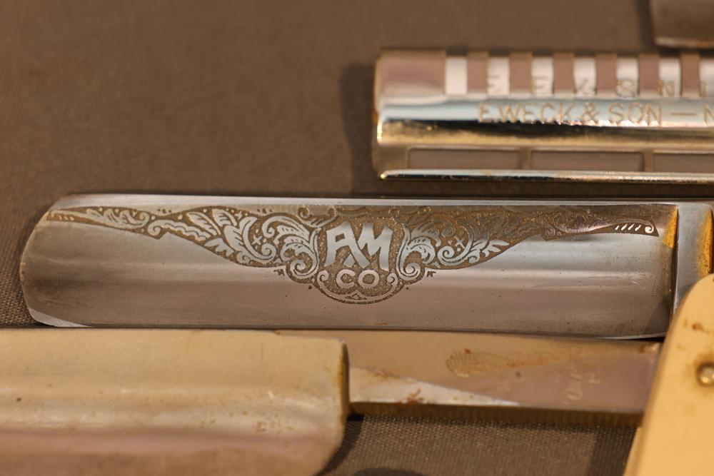 Items are from one straight razor collection & include cased matched pair of Joseph Rodgers & Sons straight razors having etched blade panels in velvet-lined Rodgers fitted case; Texas Luggage U.S. military style portable barber kit; porcelain shaving mugs with four lather brushes, collapsible compact travel shaving mirror with bowl; Warranted Razors having horn handles & notched Sheffield-style blades, etched Washington commemorative hollow blade with patriotic motif; Frederick Reynolds Sheffield straight razors; razors w/ mother of pearl scales/inlaid bar escutcheons/silver tone end caps/wedge-style blades; razors from Rogers & Sons, Wade & Butcher & Mappin's, featuring two horn scales & one celluloid with wedge style blades; razors from Clauss, J.A. Henckels, & H. Boker & Co., featuring mixed celluloid scales with hollow blades/includes multiple cases; barber Accessories including razor strops/sharpening stones/boxed Schick blades & more. Items are located in Pleasant Valley, NY.