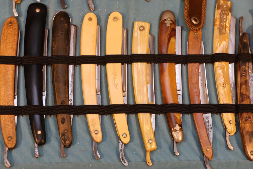 51 Straight Razors from many different makers such as M. Wolkin, Cattaraugus, and L. West, featuring celluloid, wood, and horn scales, with hollow and wedge style blades. Includes a leather rollup case with a blue softcloth interior and external handle with belt straps for storage. See photos for details. Pickup only.