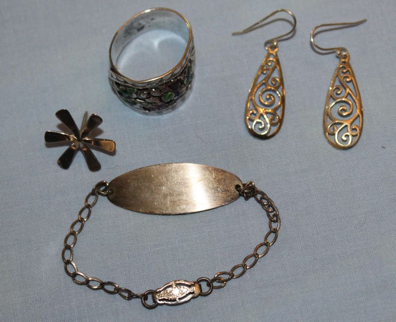 Silver jewelry with a combined weight of 44 grams. Most pieces are marked sterling or 925. Includes a vintage Coro Craft sterling brooch with rhinestones and other colored stones; sterling chains; earrings; etc. Shipping is available for this item.