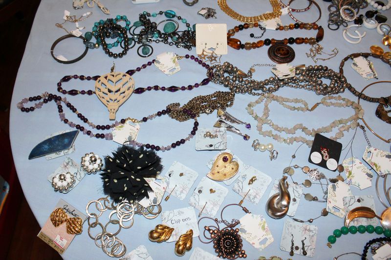 Costume jewelry including necklaces, bracelets, earrings, pins, pendants, etc. Also wth this lot are three vintage metal baby rattles.