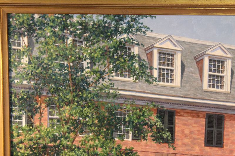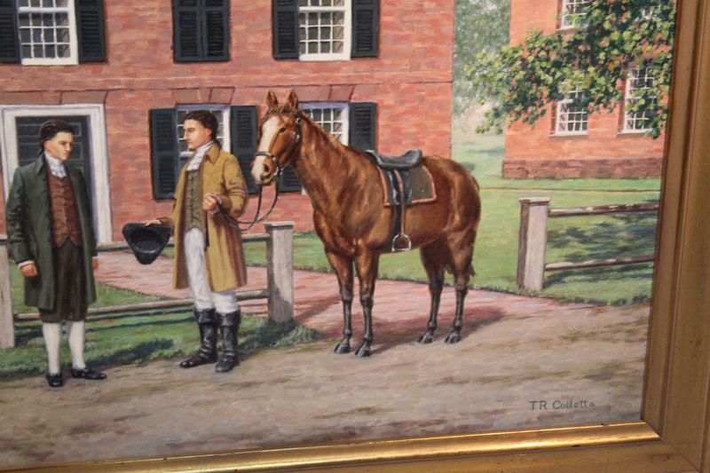 Framed Thomas R. Colletta (20th C) oil on canvas painting of men in 18th C. attire with a horse in front of an imposing brick home, signed lower right T.R. Colletta. Painting size is 23.5"Tx30"W.