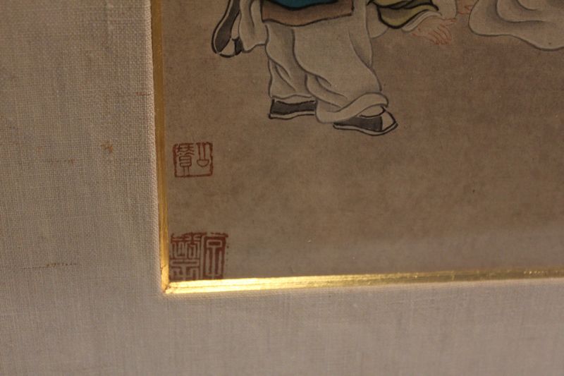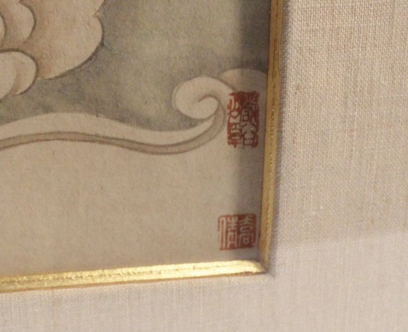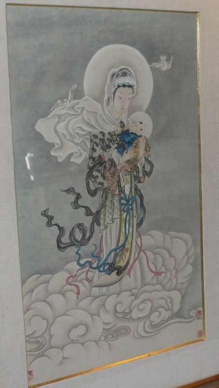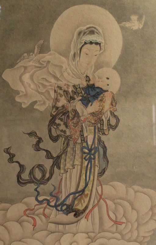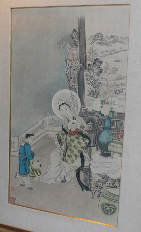 2 Chinese Christian framed prints depicting the Madonna and Child in a style that blends Christian motifs with traditional Chinese and Buddhist artistic elements. Frames are 32"Tx22"W.