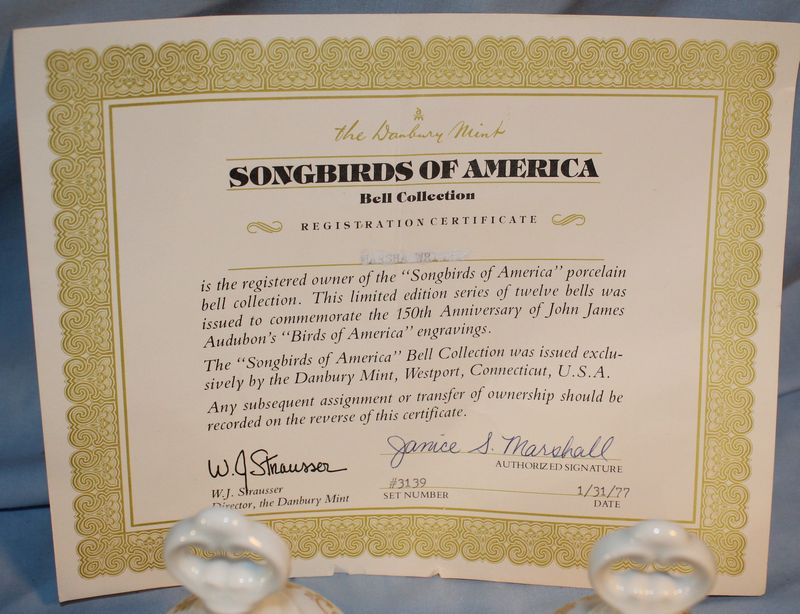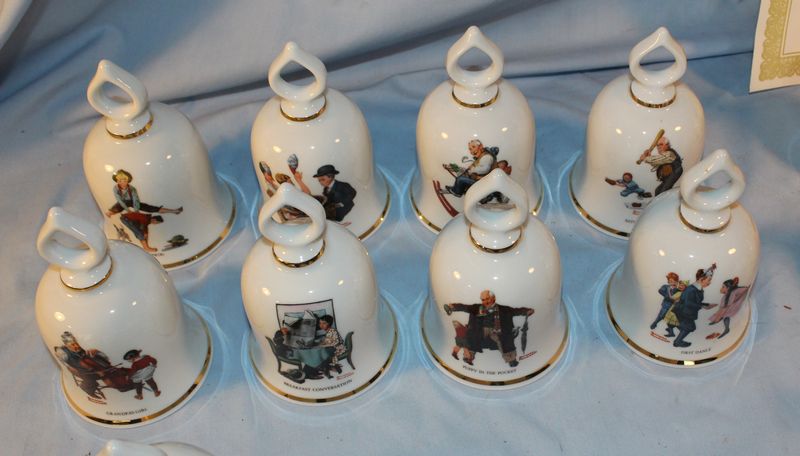 23 Danbury Mint porcelain collector bells including 12 Songbirds of America issued in 1977 (with C.O.A.) and 11 Wonderful World of Norman Rockwell C. 1979.