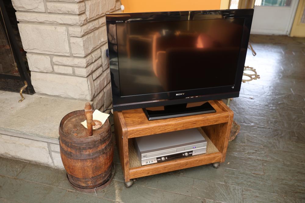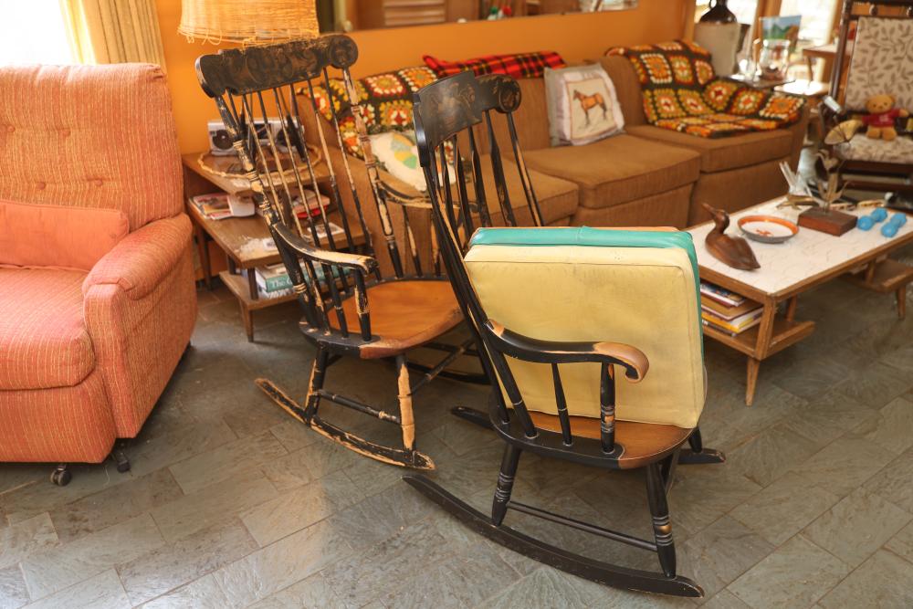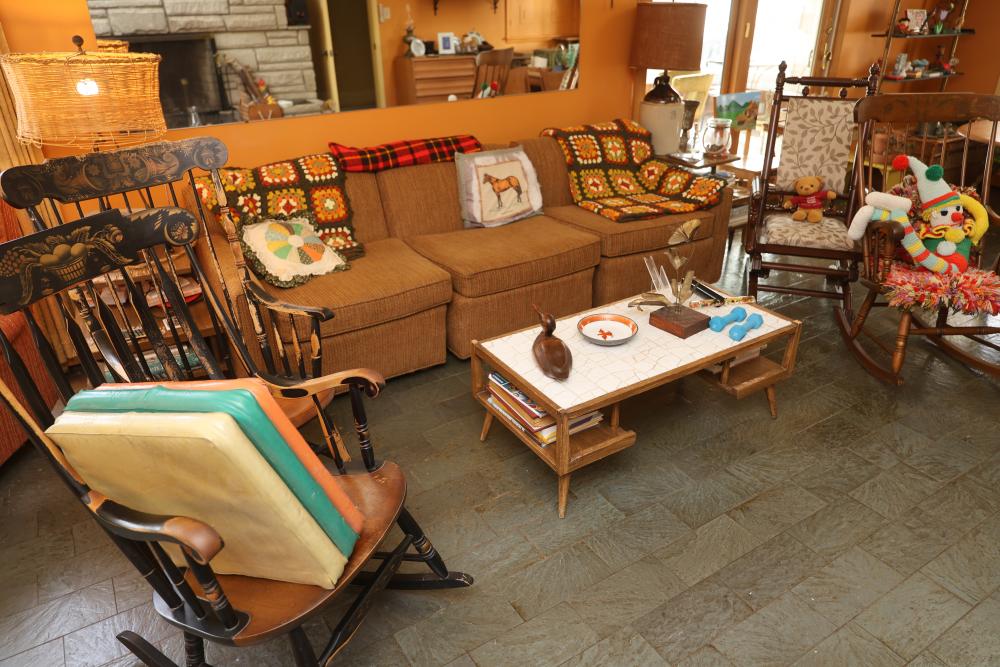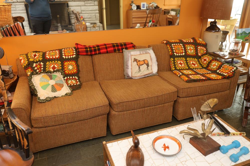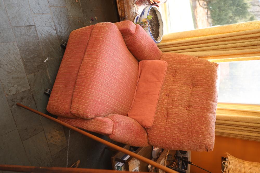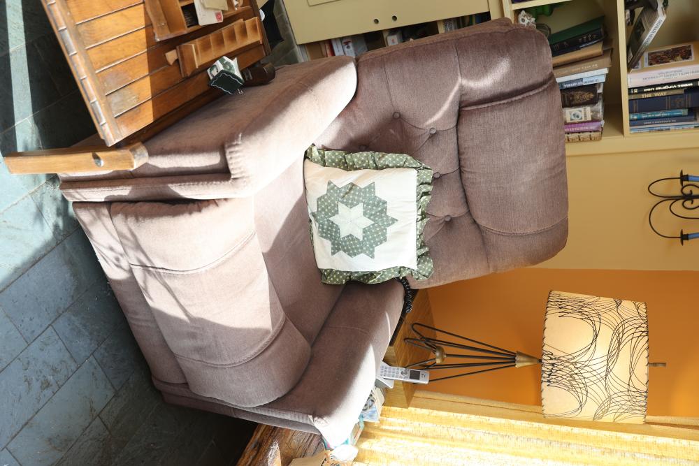 Living room furniture and home decor, including Viva Lift Power Chair Model HSW310-B-VA-1 (seller reports functional when last used), two upholstered cushioned lounge chairs, a three-drawer wooden chest of drawers with metal pulls, a three-seat upholstered cushioned couch with removable cushions, rocking chairs (one with metal springs), a Sears Solid State by Silvertone record cabinet (functionality unknown), a Singer sewing table with sewing machine removed, a Sony KDL-32S5100 LCD TV, an art easel, Etain Pur Tiel Holland pewter, two three-tier wooden end tables, two lamps (one made from a large jug), two abacuses, an octagon-shaped wooden table, various home decor, figurines, mugs, vases, and miscellaneous small items. Buyer is responsible for all help and materials necessary for safe and proper removal and must take all. Items located on first floor, no stairs. Pickup only.