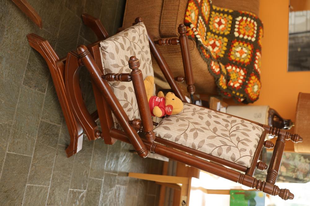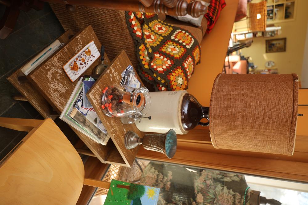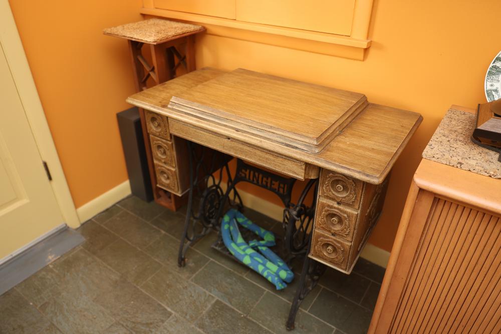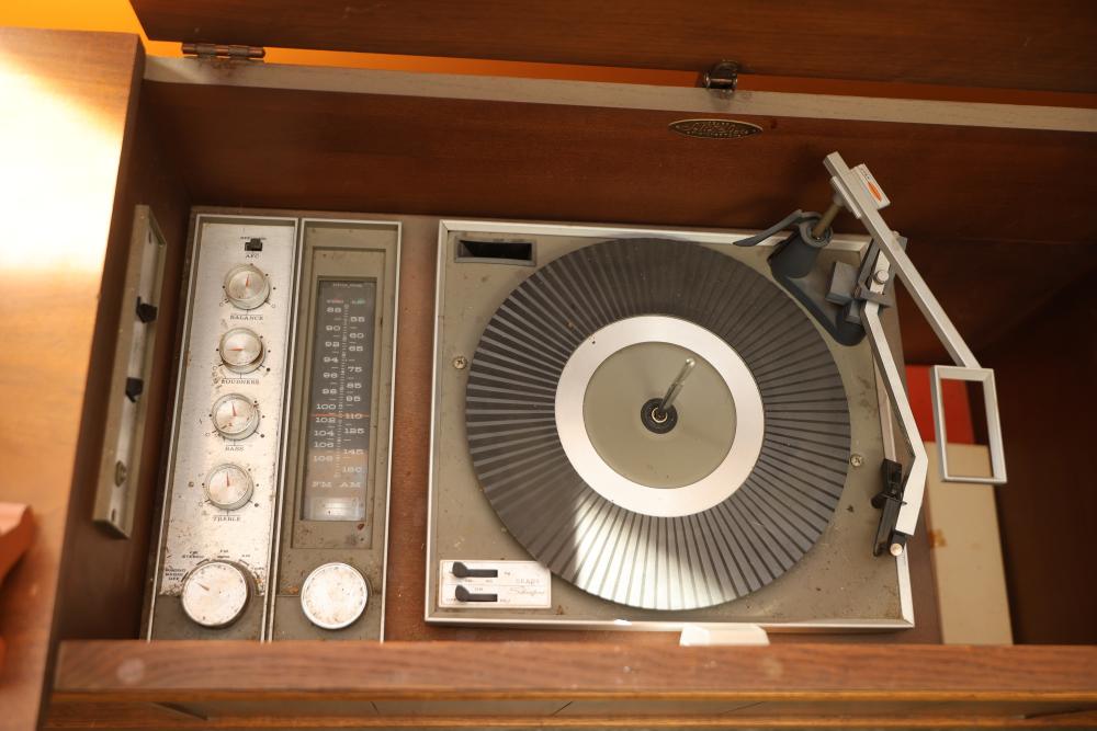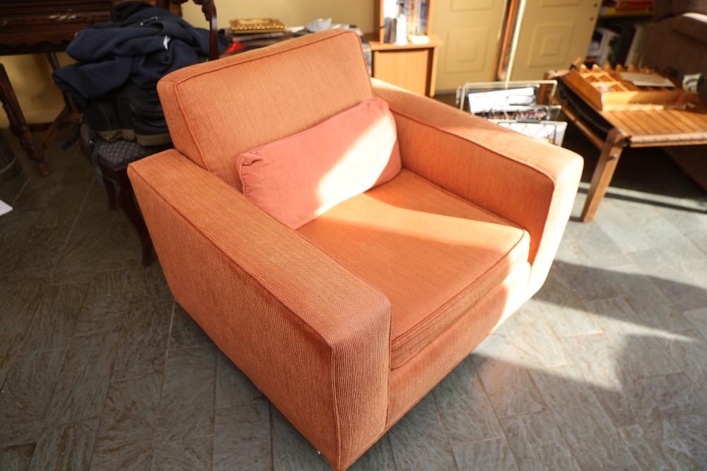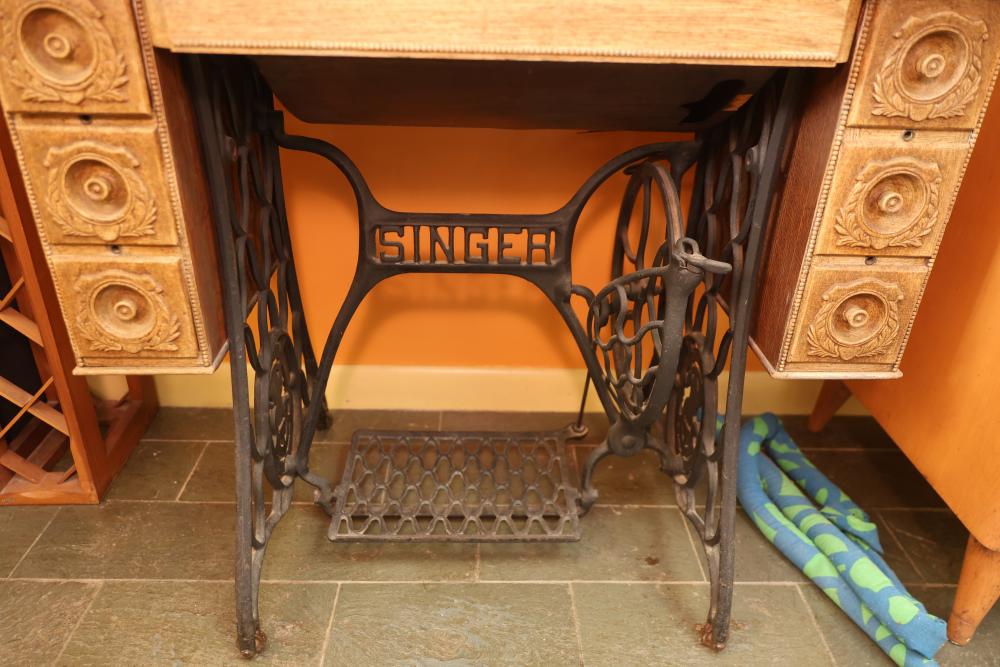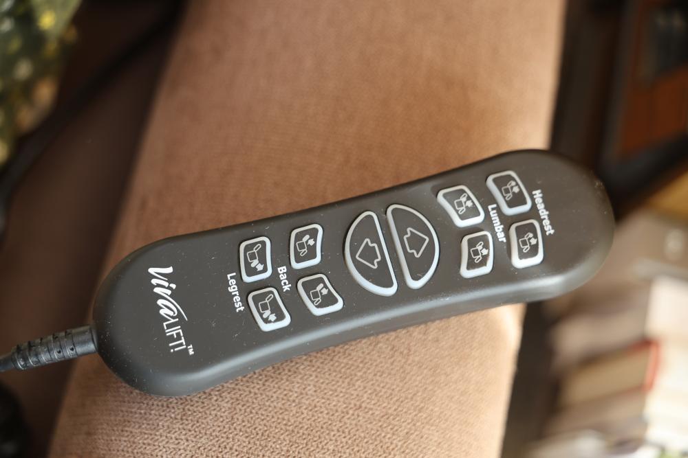 Living room furniture and home decor, including Viva Lift Power Chair Model HSW310-B-VA-1 (seller reports functional when last used), two upholstered cushioned lounge chairs, a three-drawer wooden chest of drawers with metal pulls, a three-seat upholstered cushioned couch with removable cushions, rocking chairs (one with metal springs), a Sears Solid State by Silvertone record cabinet (functionality unknown), a Singer sewing table with sewing machine removed, a Sony KDL-32S5100 LCD TV, an art easel, Etain Pur Tiel Holland pewter, two three-tier wooden end tables, two lamps (one made from a large jug), two abacuses, an octagon-shaped wooden table, various home decor, figurines, mugs, vases, and miscellaneous small items. Buyer is responsible for all help and materials necessary for safe and proper removal and must take all. Items located on first floor, no stairs. Pickup only.
