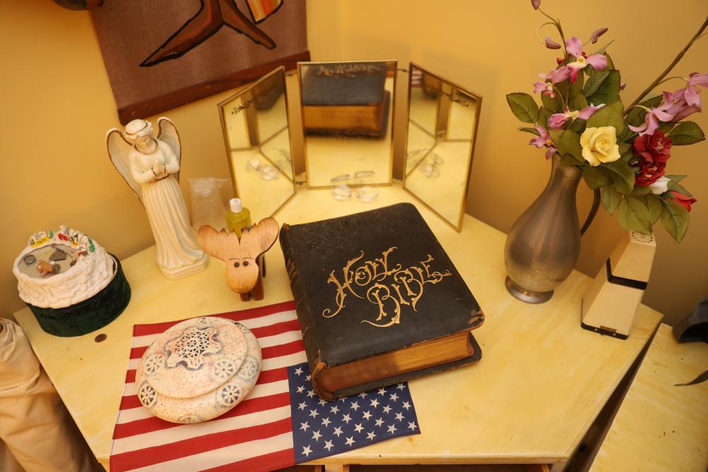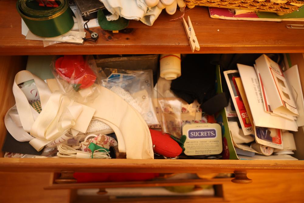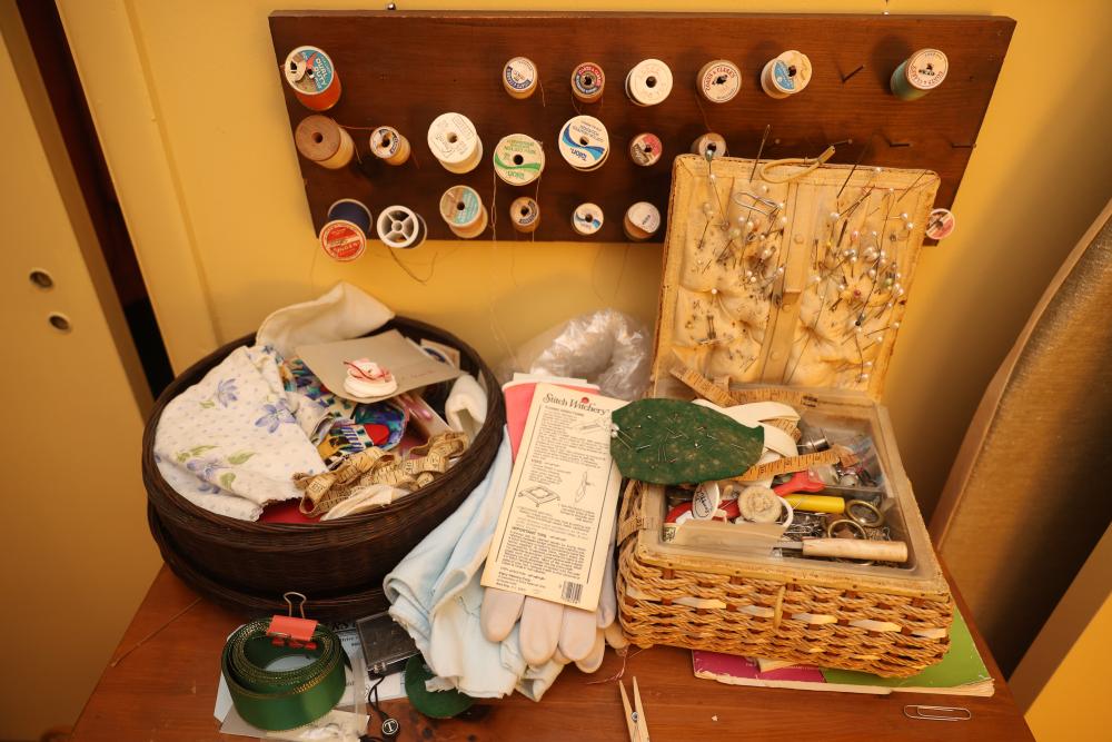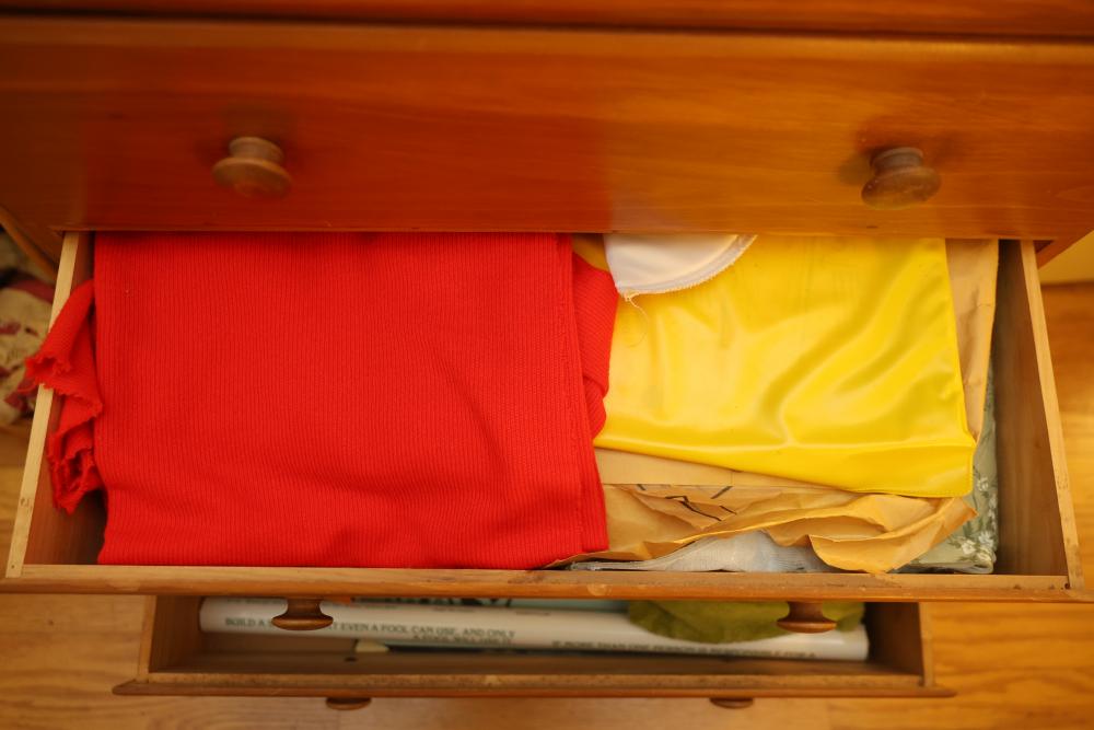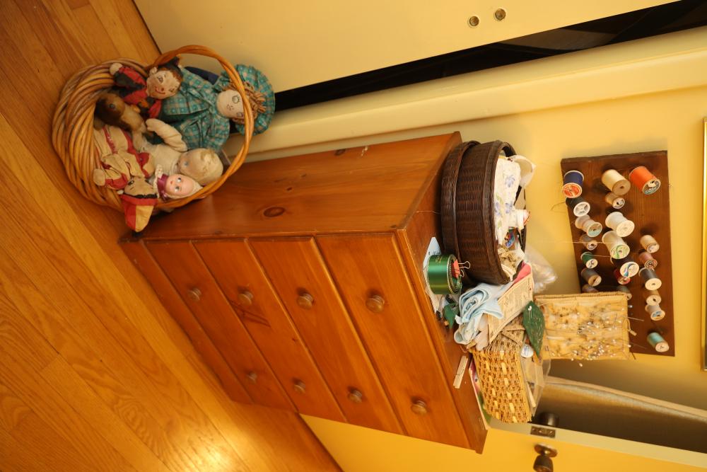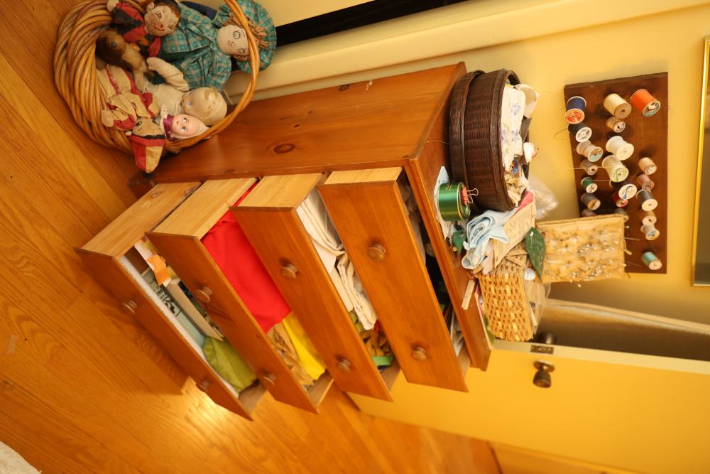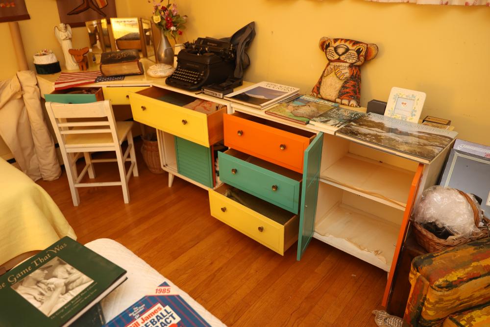 Colored Furniture, Sewing Supplies, Remington Typewriter, Dolls, and home decor items including a multi-colored dresser, a four drawer dresser, Remington Typewriter, an upholstered lounge chair with removable cushion, four pieces of framed wall art, a Ringling Bros Circus Poster, two unused photo albums, decorative figurines, mirrors, oil-lantern style electric lamp, upholstered chair, sewing supplies, fabric pieces, gift-wrapping ribbons, and an ironing board. Largest item is 40in x 15in x 30in. Does not include items from other lots. Buyer is responsible for all help and materials necessary for safe and proper removal. Buyer must take all. Items located on first floor, no stairs. Pickup only.