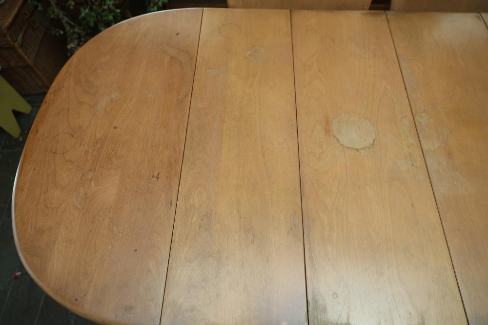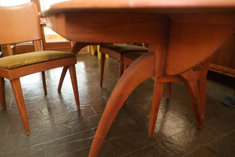 Heywood-Wakefield drop-leaf table with six chairs, displaying curved double-splayed legs, and a matching sideboard with multiple drawers. Includes all contents in and on the sideboard and table, such as utensils, decorative items, and accessories shown. Does not include items from other lots. Buyer is responsible for all help and materials necessary for safe and proper removal. Buyer must take all. Items located on first floor, no stairs. Pickup only.
