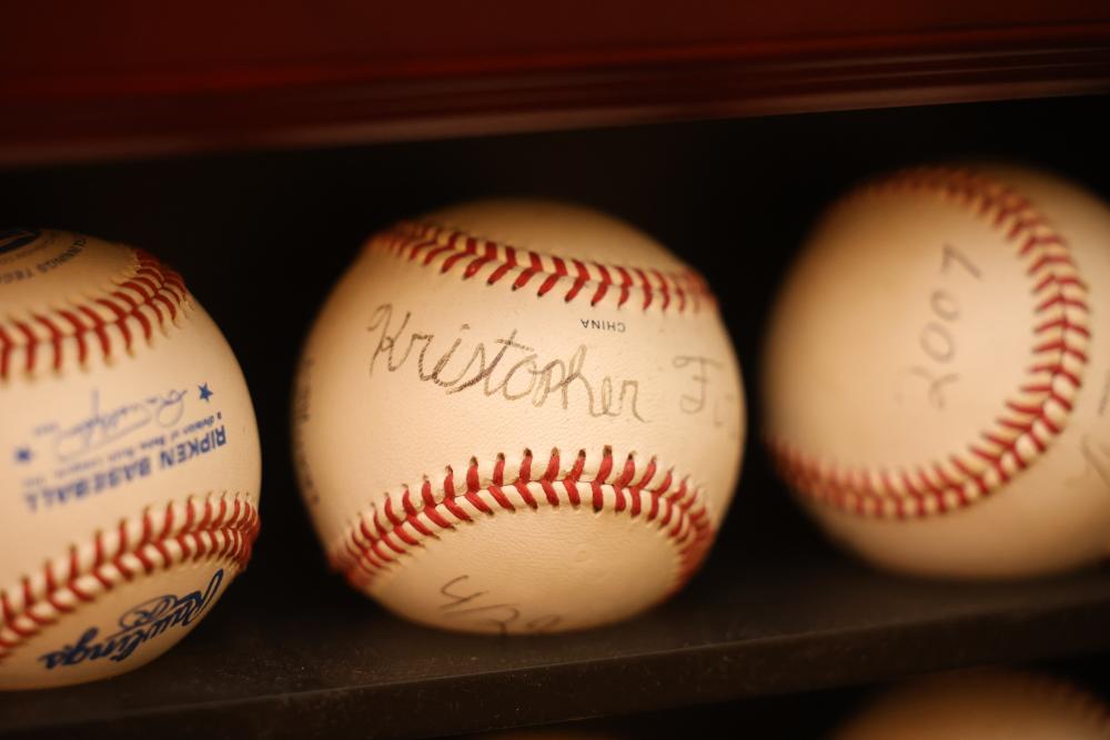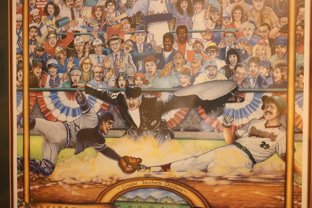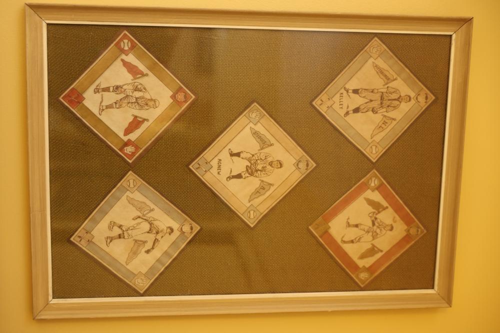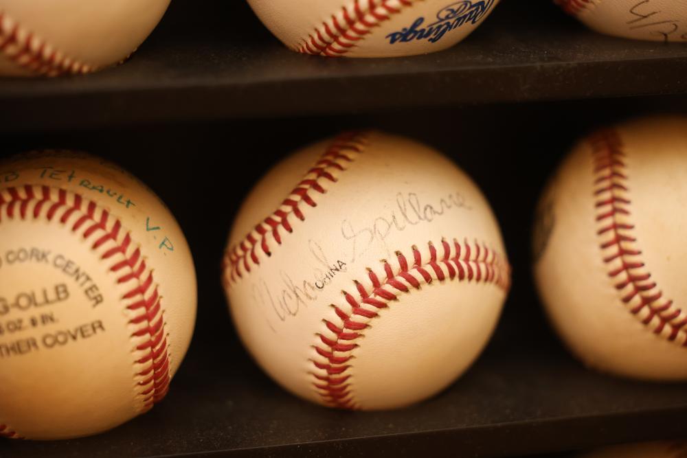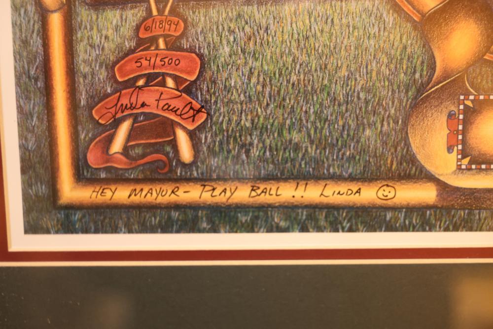 Baseball Memorabilia Including Signed Baseballs, Books, and Framed Art. This assortment includes autographed baseballs displayed in a case, baseball-themed books, and framed items, including a limited-edition art print commemorating the 1994 inaugural season of the Renegades. A vintage-style catchers mask and other baseball-related framed collectibles are also featured. Does not include items from other lots. Buyer is responsible for all help and materials necessary for safe and proper removal. Buyer must take all. Pickup only.