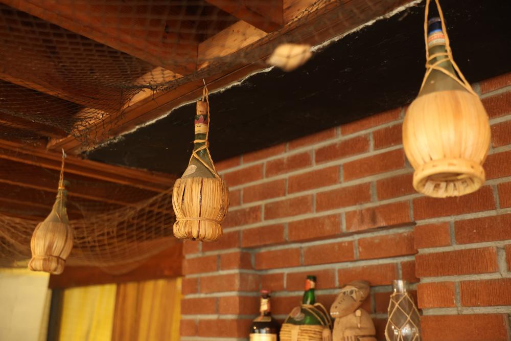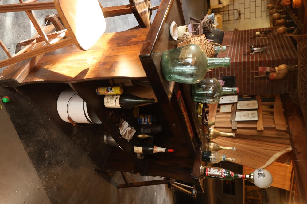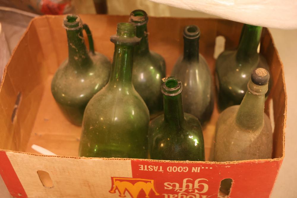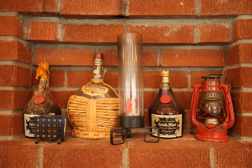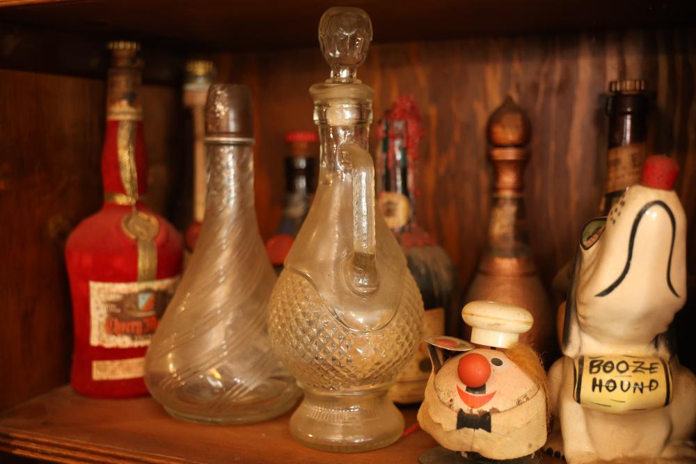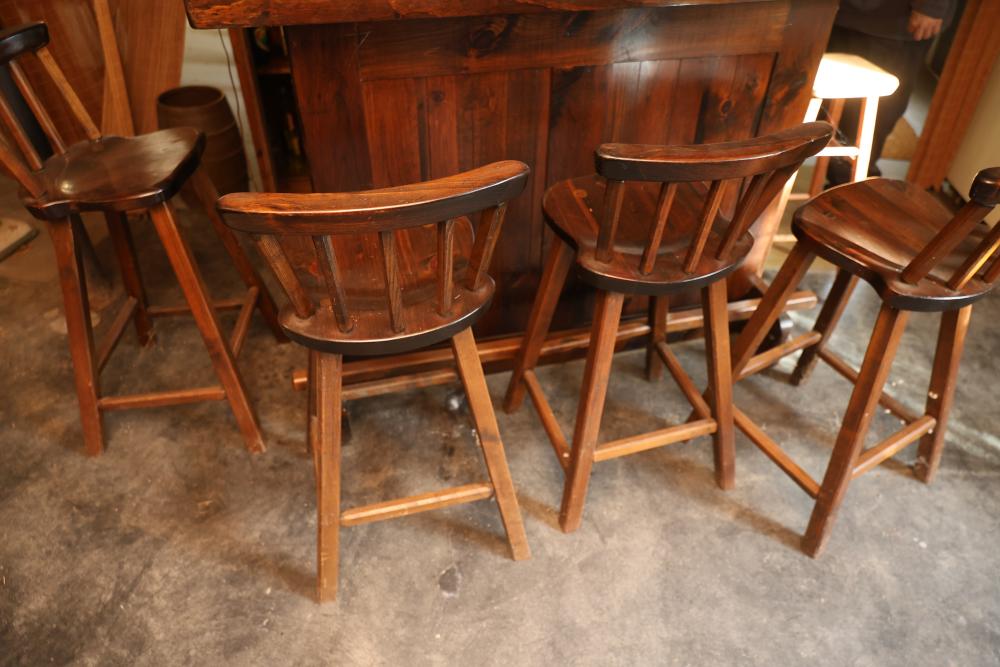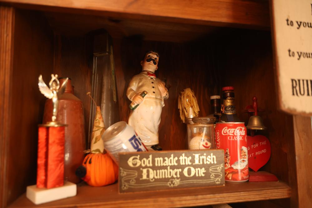 Home Bar Setup With Accessories and Mirror Featuring Irish Whisky Design. Includes a wooden bar (62in x 25in x 44in) with four matching stools and storage shelves, a bar back (64in x 18in x 81in), a decorative Maloney's Irish Whisky mirror, various bar accessories, multiple decorative liquor bottles, mugs, and jugs. Does not include liquid contents. Does not include items from other lots. Buyer is responsible for all help and materials necessary for safe and proper removal. Buyer must take all. These items are located in the basement with access to ground floor. Pickup only.
