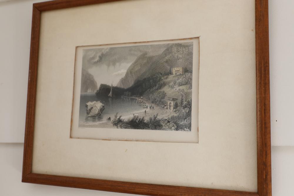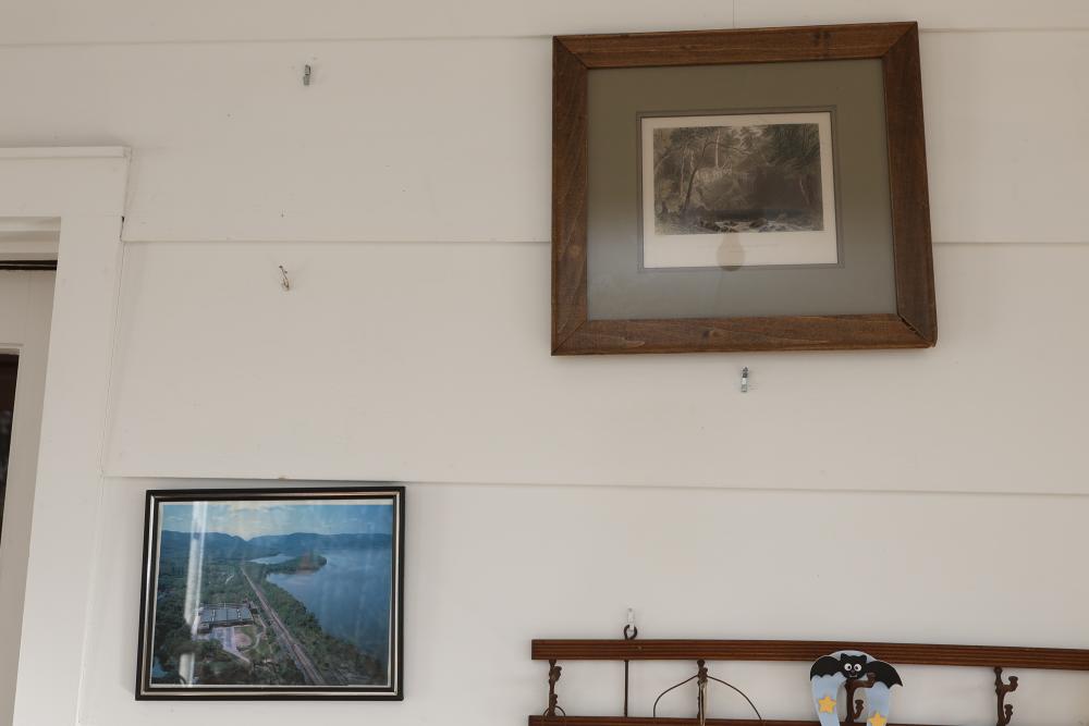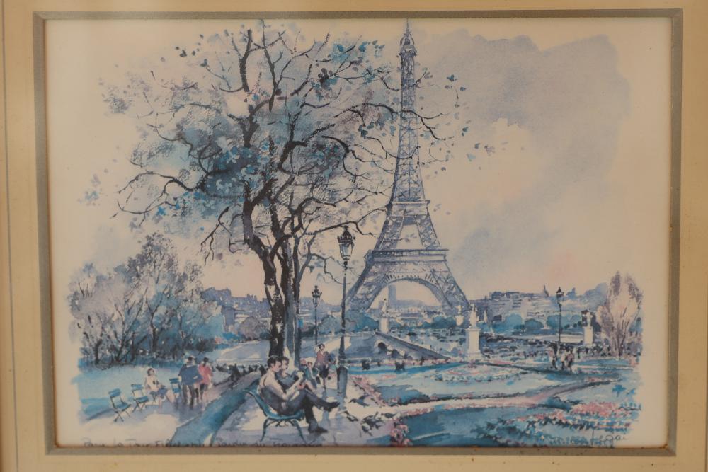 Framed Artwork and Prints with Mixed Wall Decor. Includes a watercolor-style depiction of the Eiffel Tower with park, a framed photograph of a waterfall, three vertically framed architectural scenes, an etched stone with bird motif, a scenic shoreline watercolor, framed woodland and lakeside art prints, a framed cross-stitch of a milkmaid, framed Snoopy illustration poster, two animal-themed hangings, a framed image of a lakeside landscape, an engraved wall panel, etc. Does not include items from other lots. Buyer must take all. Pickup only.