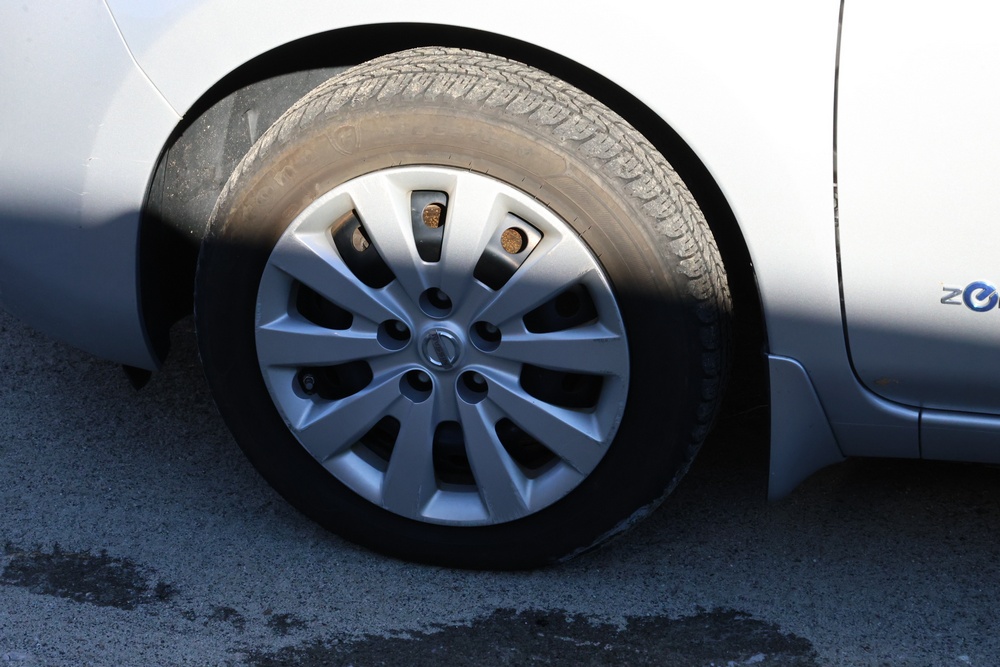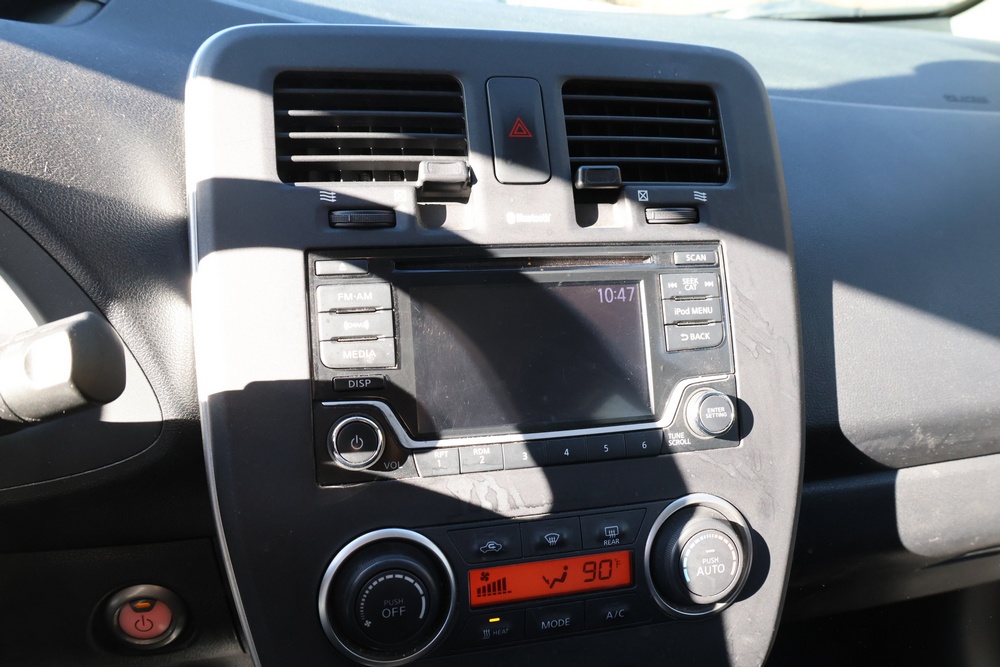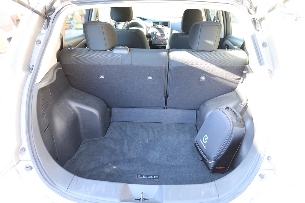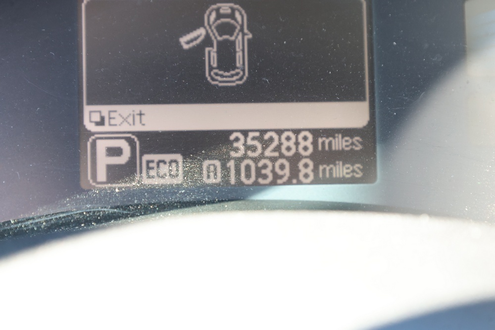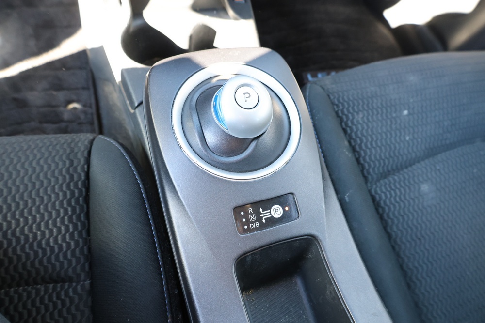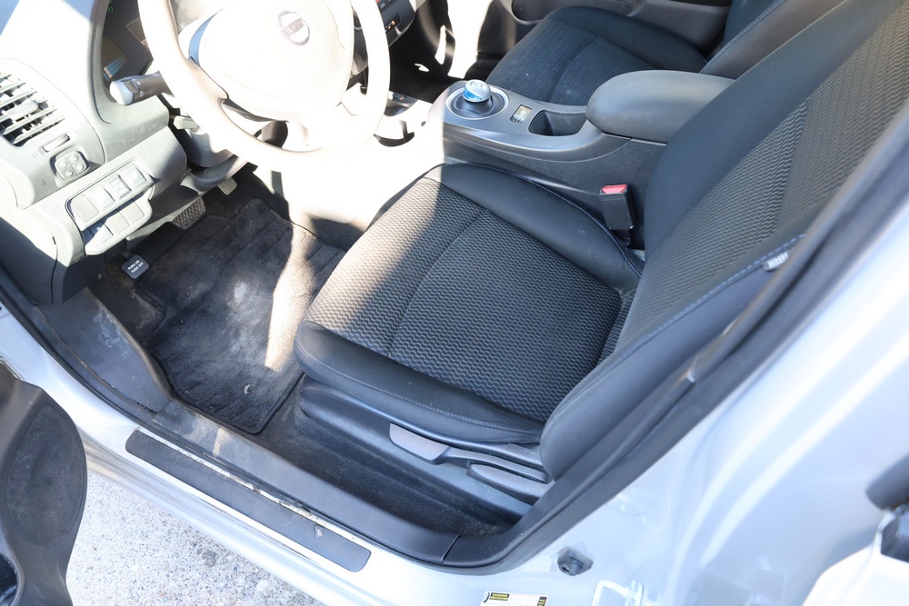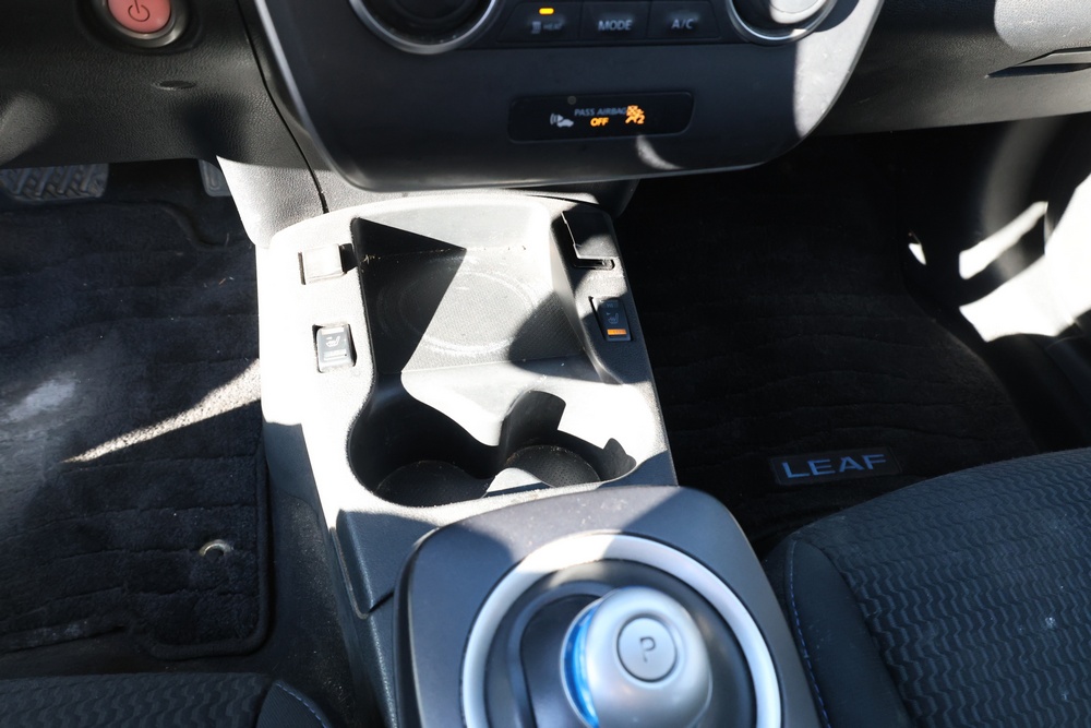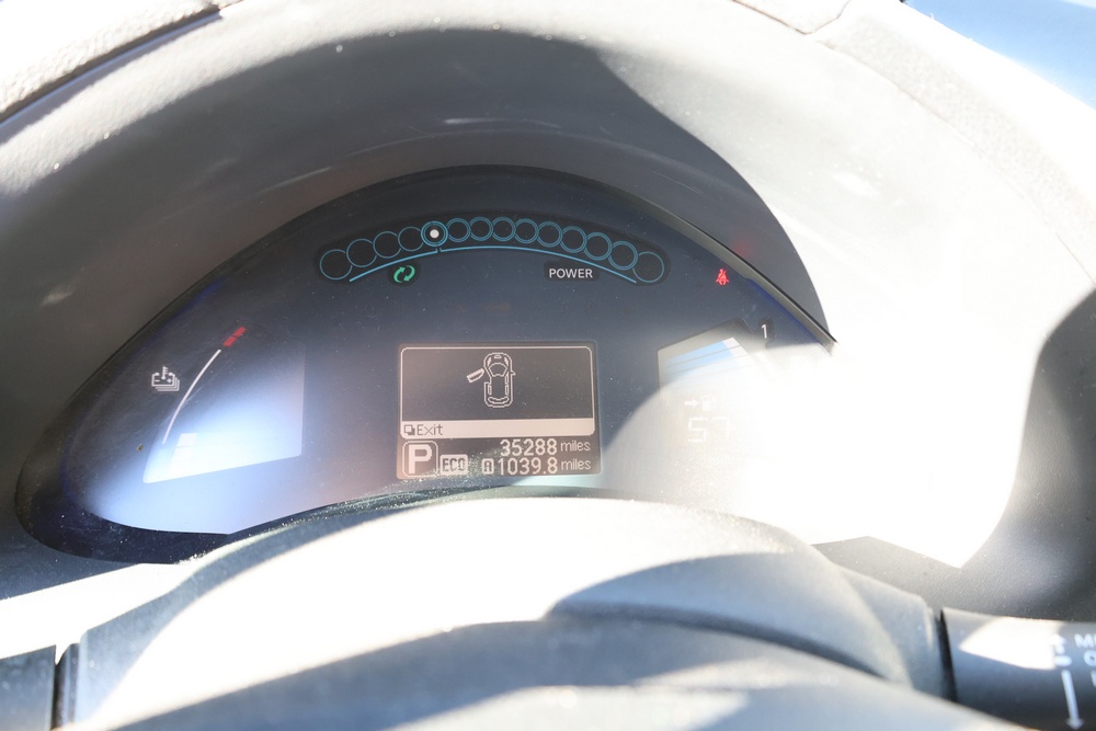 2017 Nissan Leaf SV electric hatchback showing 35,288 miles, VIN 1N4BZ0CPXHC307165, equipped with cloth interior, touchscreen infotainment with Bluetooth, automatic climate control, push-button start, selector-dial shifter. Seller reports: Runs and drives however, the battery range has significantly decreased to approx. 60 miles per full charge.