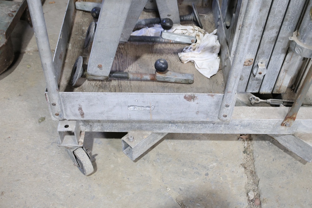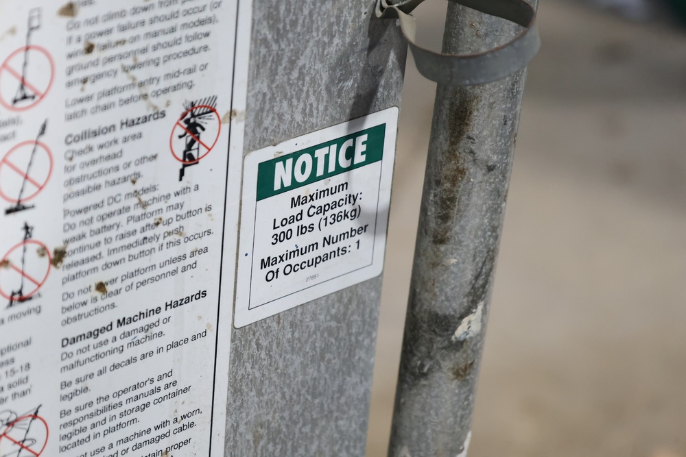 Electric-powered Genie personnel lift on a rolling base, equipped with a Doerr/Emerson 1/2 HP motor (model PR607983BA298B) with dual-voltage capability (100–115V / 200–230V). Includes platform, outriggers, and lift mechanism as shown. Seller reports: Operates as intended.