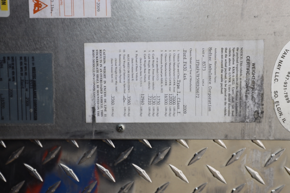 2009 Ford F-450 Super Duty XLT 4x4 Type I Ambulance. Mfg. by Medtec Ambulance Corp. Odometer reading: 61,765. VIN: 1FDAF47R59EB26672. Body: Chassis 2D. Engine: Power Stroke 6.4L V8 CRDI Diesel. Seller reports: Runs, drives, operates, no known problems. Title & Key available. Stretcher Not Included.