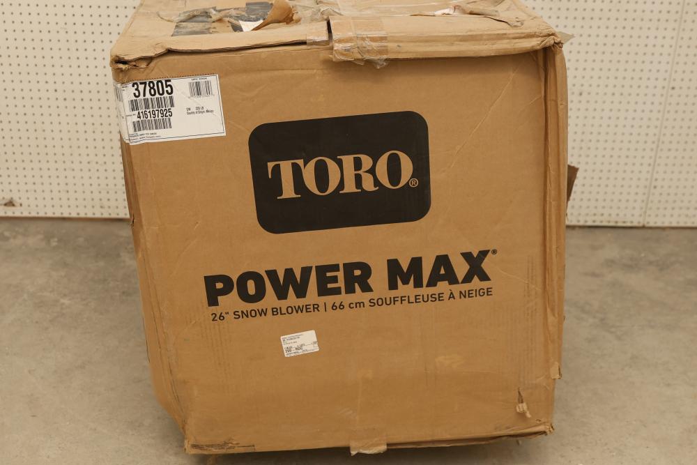 Toro Power Max 826 OHAE electric start snow blower, Model 37805, featuring a 252cc engine, a 26 inch clearing width, hand warmers, and LED lights. Pickup only.