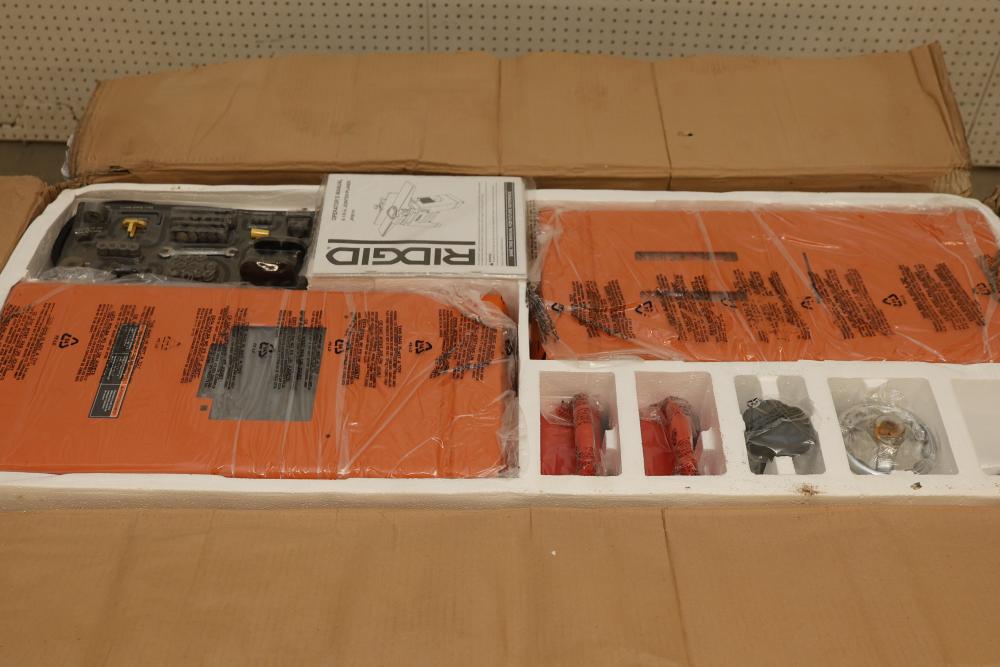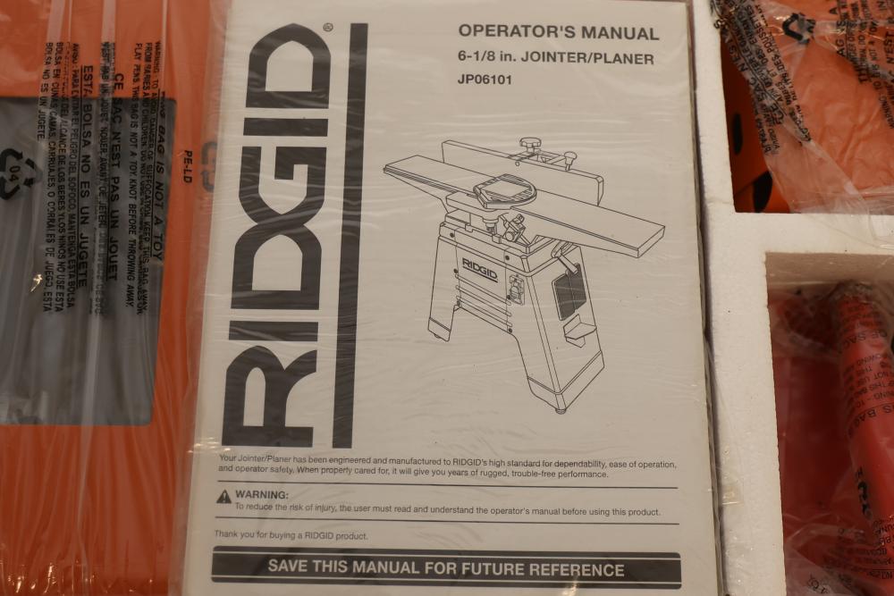 Ridgid 6 and 1/8 Inch Jointer/Planer Model JP06101. Features a 1 HP induction motor with a 15,000 RPM single-speed cutterhead, three HSS jack screws, and 45-degree fence adjustment. The unit is packaged in its original box, with the operators manual and parts included. Pickup only.