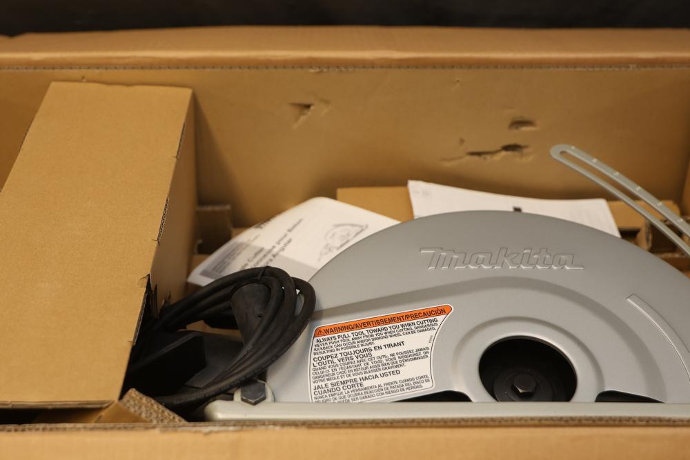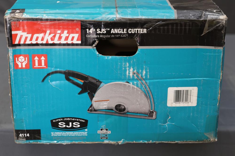Makita 14 Inch SJS Angle Cutter 4114. The cutter features a 14-inch blade for high-performance cutting and the SJS (Super Joint System) to prevent motor damage caused by accidental binding. It comes in its original packaging, with some signs of wear on the box. Pickup only.