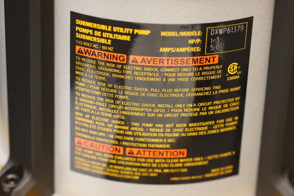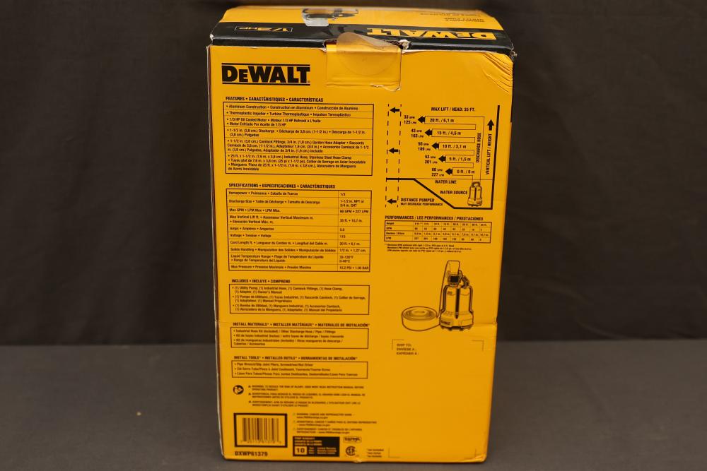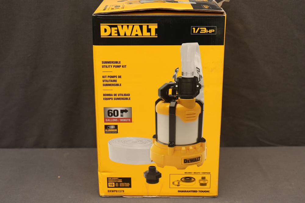 Dewalt 1/3 HP 115V Submersible Utility Pump Kit DXWP61379. Includes a powerful 1/3 HP motor, 115V capacity, and designed for efficient water removal. Comes with a durable pump, hose, fittings, and an instruction manual. Features 60-minute auto shutoff and a thermoplastic construction for durability. Pickup only.
