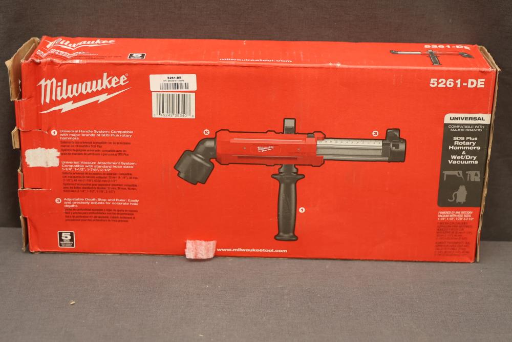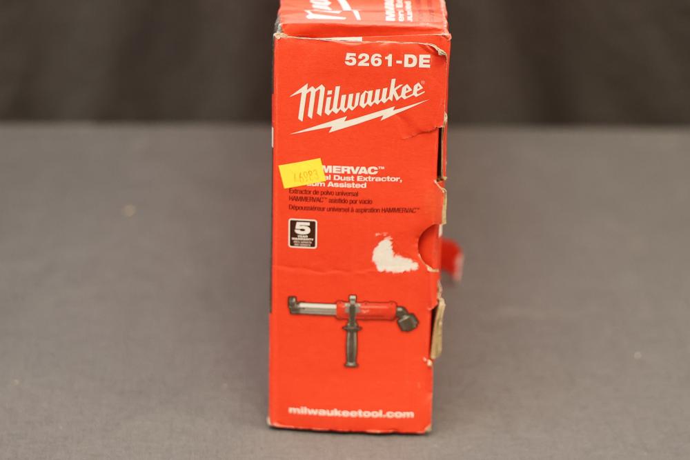 Milwaukee Hammervac Universal Dust Extractor, Vacuum Assisted 5261-DE. Includes the Milwaukee 5261-DE unit, handle, multiple clamps, and manuals. Designed for efficient dust extraction and universal fitment. Ideal for use with rotary hammers and compatible tools. Pickup only.