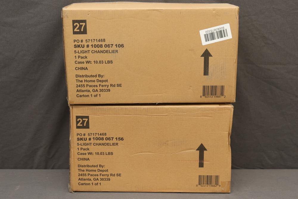 Two Home Decorators Collection 5-Light Chandeliers - One in Brushed Nickel Finish with White Fabric Shade, one in Matte Black Finish with White Fabric Shade. Each chandelier features a modern design, suitable for various room settings. Pickup only.