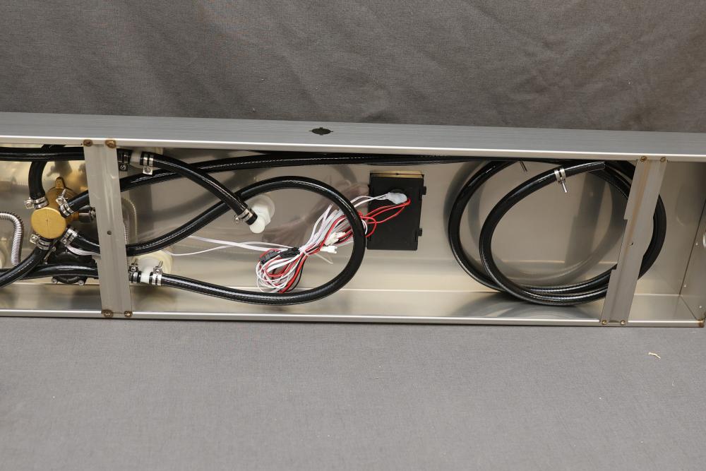 BWE Onyx Spa All-in-One Black and Nickel 20 Inch Waterfall Dual Head Shower Toner System with 6-Way Diverter. Includes a ceramic disc valve (YTP20-BNK). Features a sleek black and nickel finish, dual shower heads, six-way diverter, and waterfall option. Comes with various hardware components as pictured. Pickup only.