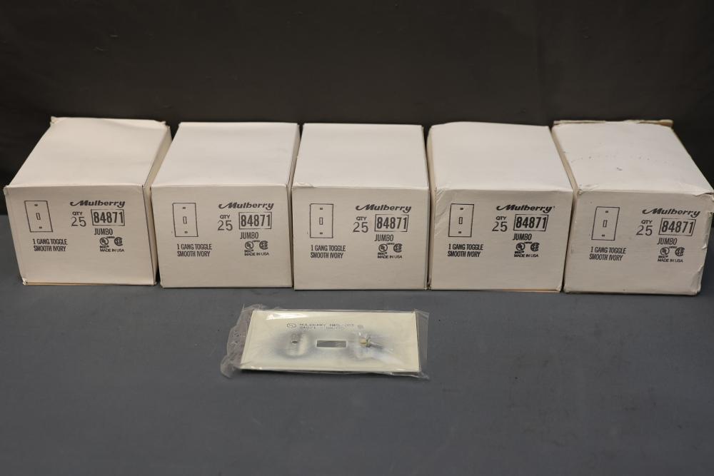 Mulberry 84871 1 Gang Toggle Switch Wall Plate in Ivory - Jumbo Size - 5 cases of 25 each, totaling 125 plates. Each plate is individually wrapped, and screws are included. Designed for single toggle switches, these jumbo-size wall plates are ideal for larger coverage. Pickup only.