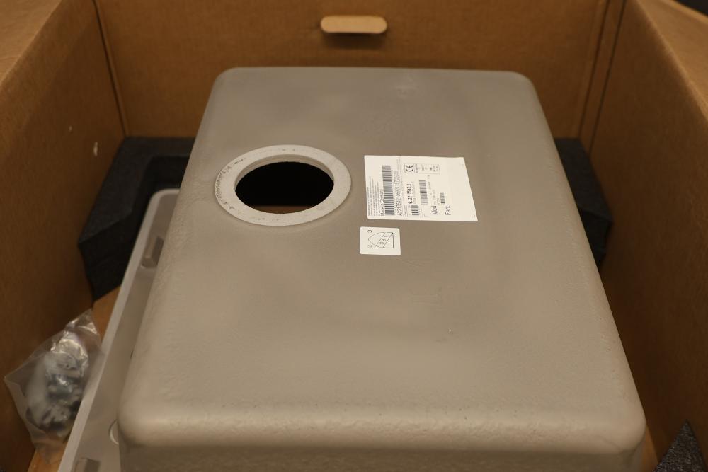 Glacier Bay Stonehaven 25 Inch Drop-In Single Bowl Taupe Ice Granite Composite Kitchen Sink with Taupe Strainer. Features durable granite composite construction and a taupe ice finish. Includes a matching taupe strainer. Model STHVTN100SDM 42. Pickup only.