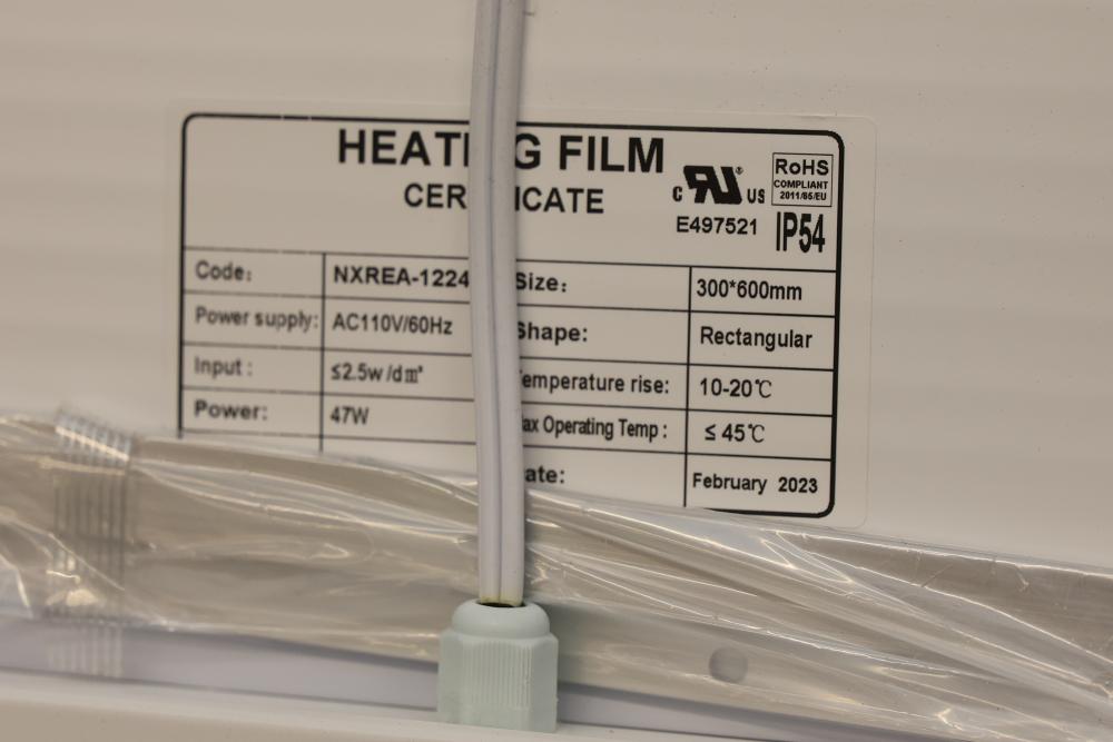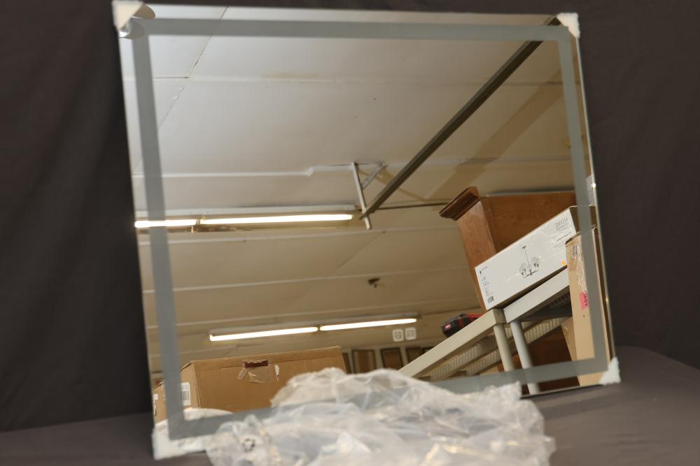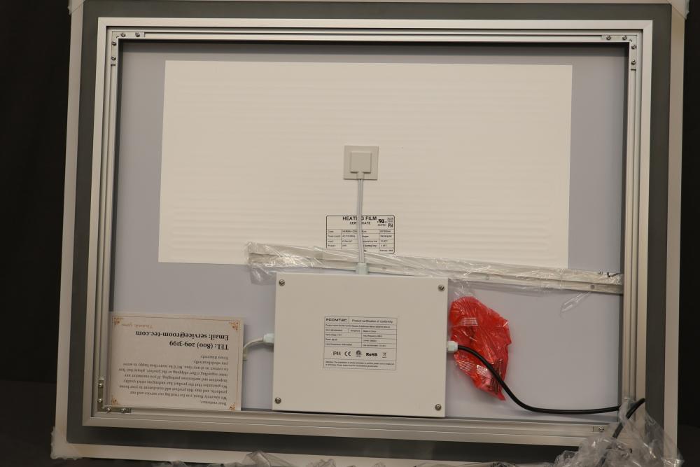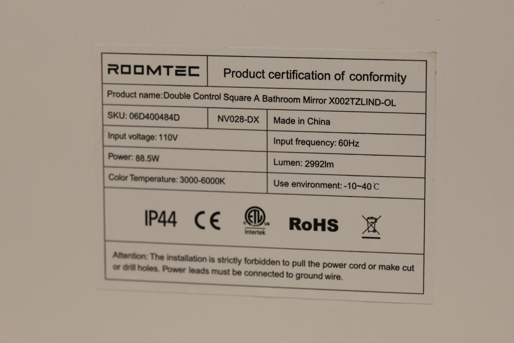 Roomtec Double Control Square A Bathroom Mirror (X002TZLIND-OL). Features a rectangular design with dimensions of 48 inches by 30 inches. Equipped with LED lighting and heating film for defogging, operating at 110V with a power of 47W. Includes IP44 and IP54 certifications for electrical safety and water resistance. Pickup only.