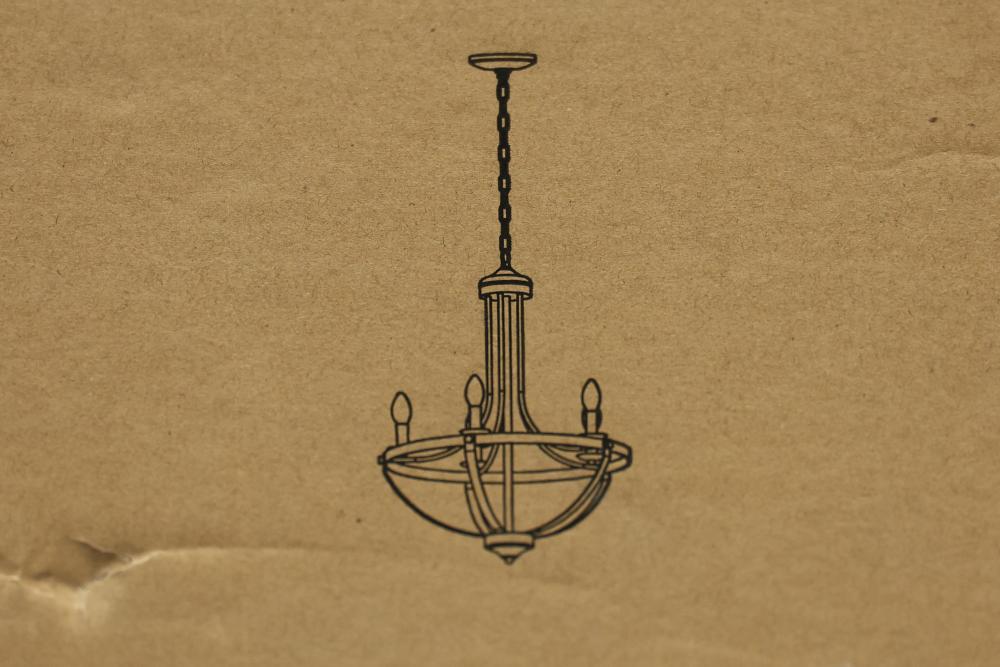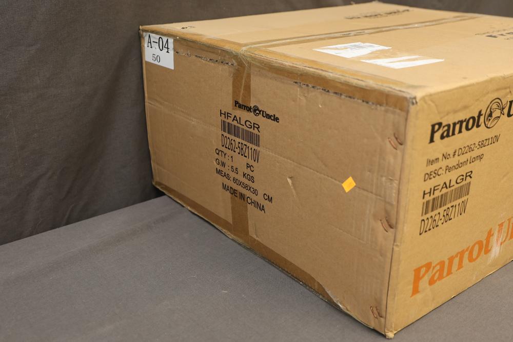 Parrot Uncle Pendant Lamp (D2262-5BZ110V). This pendant lamp features a stylish design with multiple light sockets and a black-bronze finish. The fixture is new and comes in its original box with parts securely packaged. The box is labeled with model details, ensuring authenticity. Pickup only.